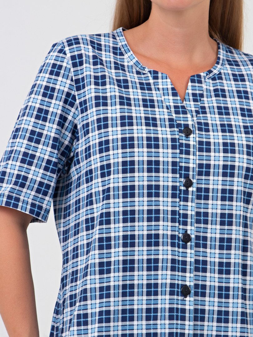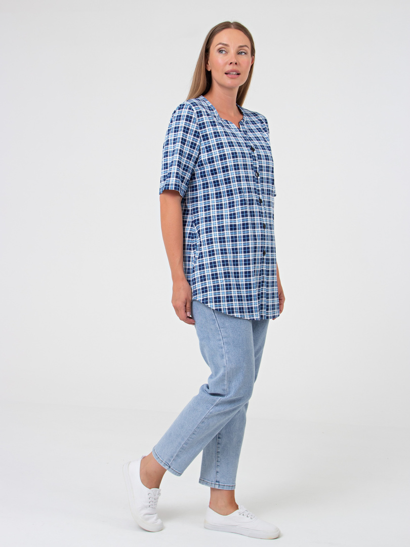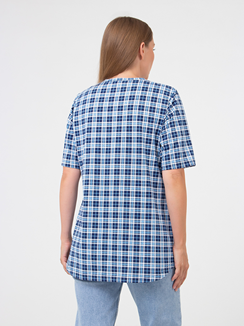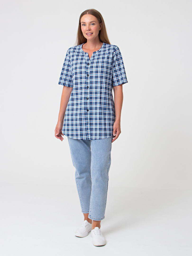 Удлиненная блуза выполнена из трикотажа. Модель полуприлегающего  силуэта с фигурным низом. Изделие с коротким втачным рукавом.  Круглый вырез имеет косую планку, переходящую в застежку на пуговицы. Блуза имеет  карманы в боковых швах с окантованным входом.