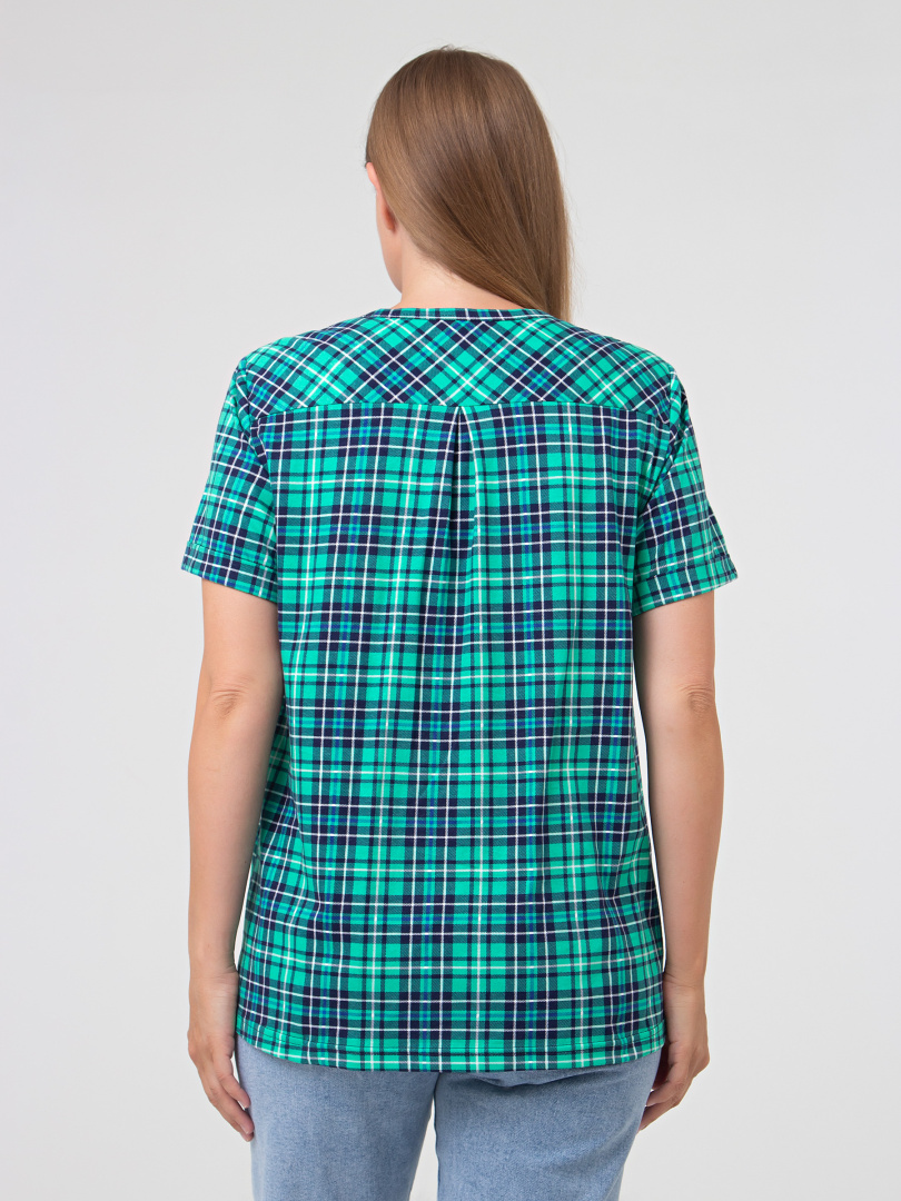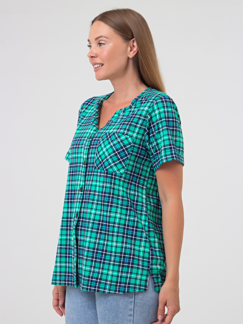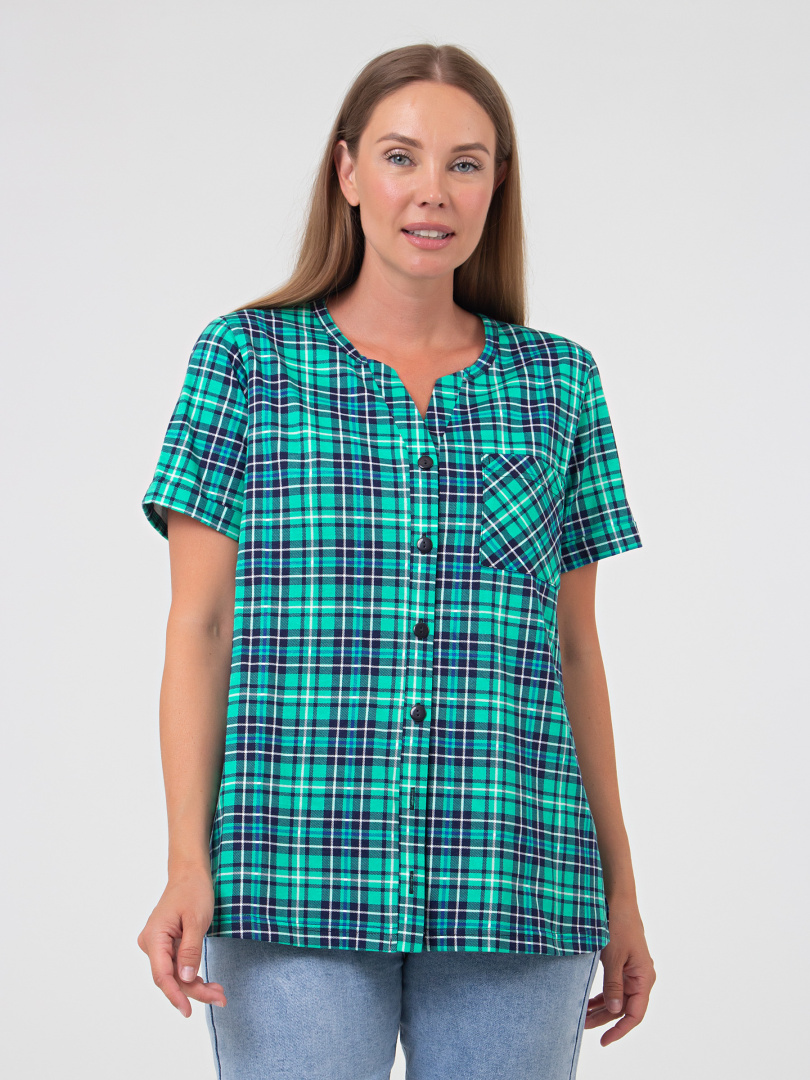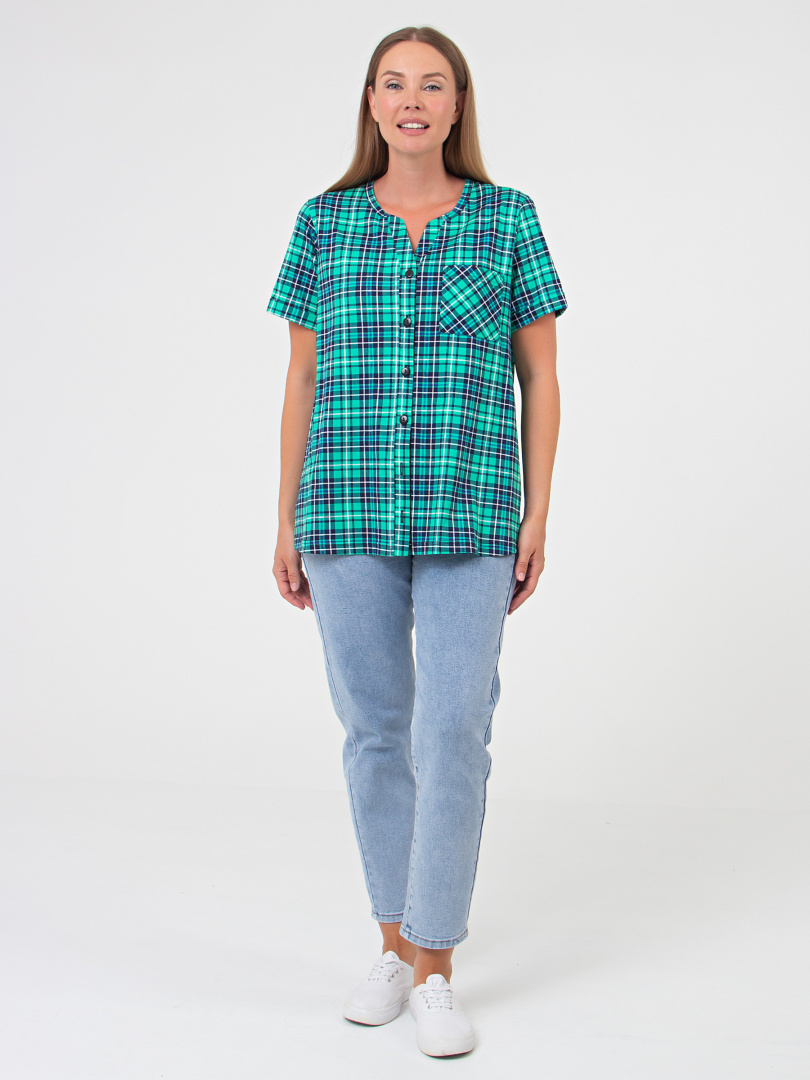 Блуза выполнена из хлопкового трикотажа. Модель прямого силуэта с боковыми разрезами. Рукава короткие втачные. Круглый вырез горловины с косой планкой, переходящей в застежку на пуговицы.