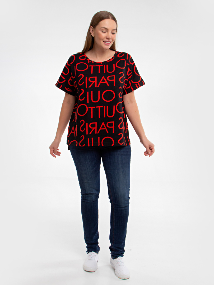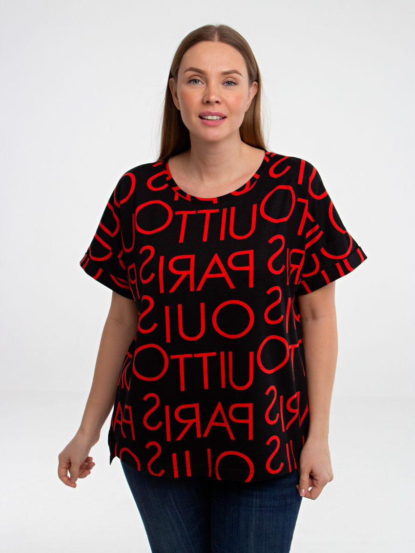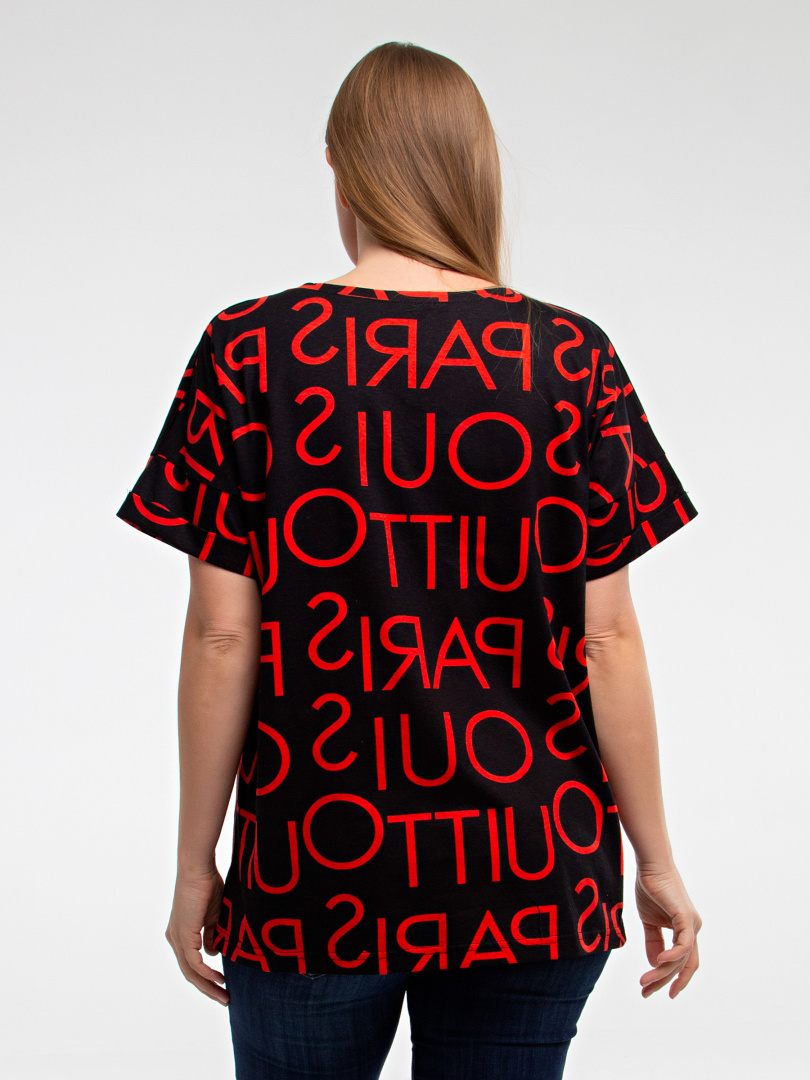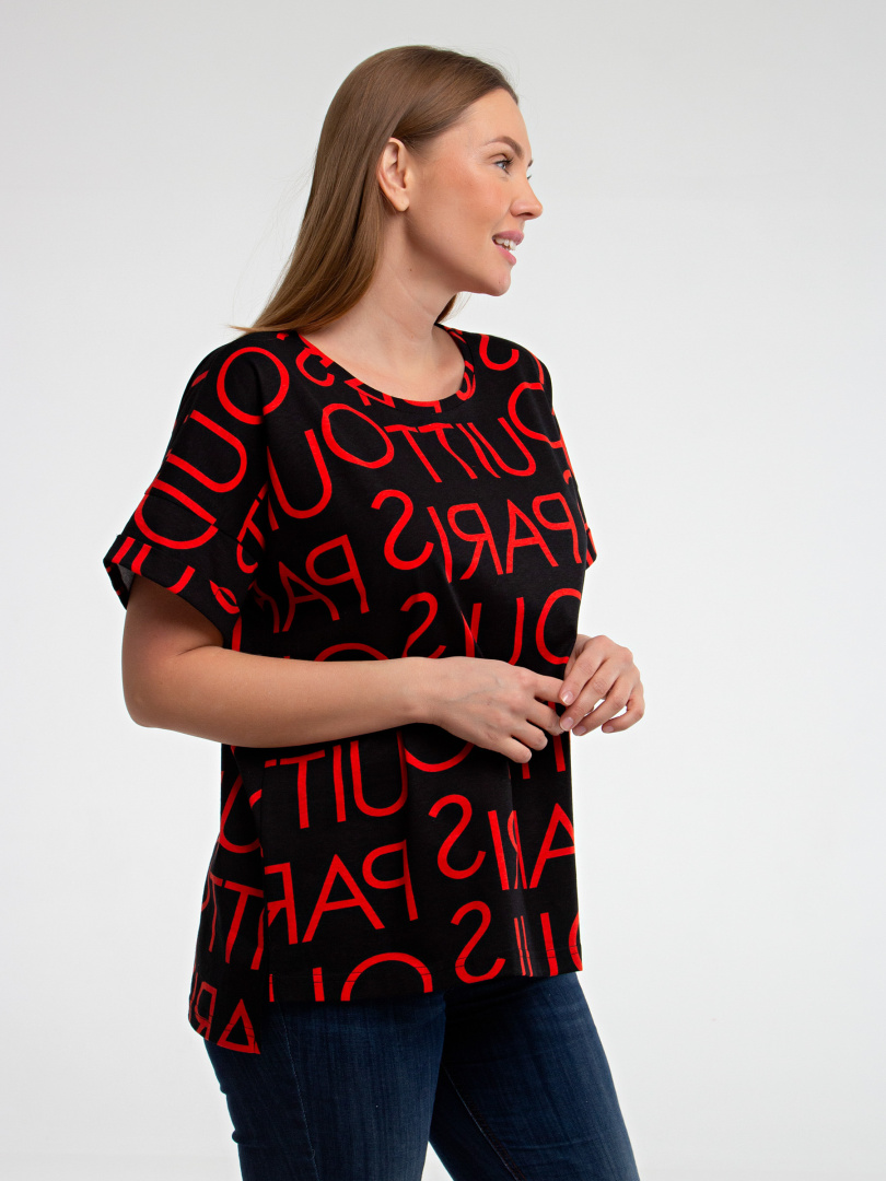 Блуза средней длины, выполнена из хлопкового трикотажа со стильным принтом. Покрой свободный со спущенным рукавом. По низу рукава – отвороты. Вырез круглый. Особенность модели – удлинённая спинка.