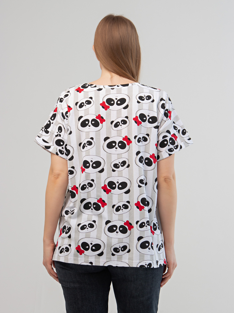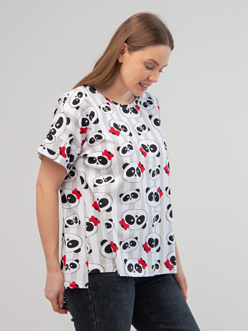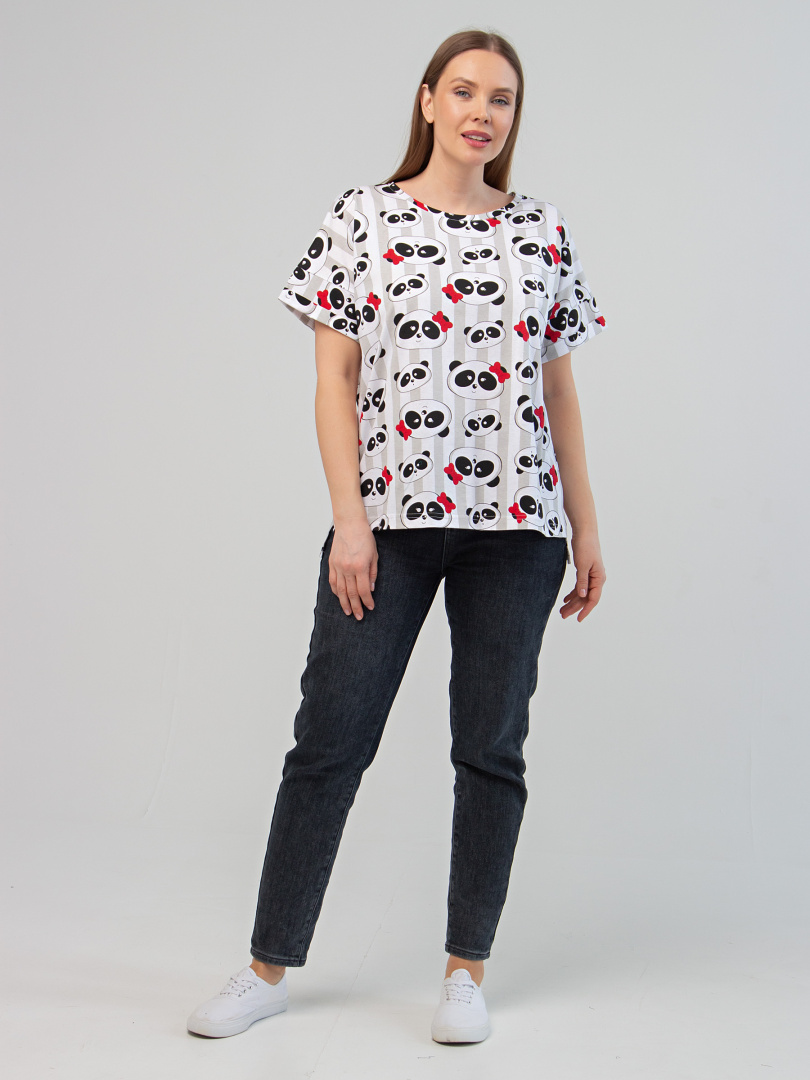 Блуза средней длины, выполнена из хлопкового трикотажа со стильным принтом. Покрой свободный со спущенным рукавом. По низу рукава – отвороты. Вырез круглый. Особенность модели – удлинённая спинка.