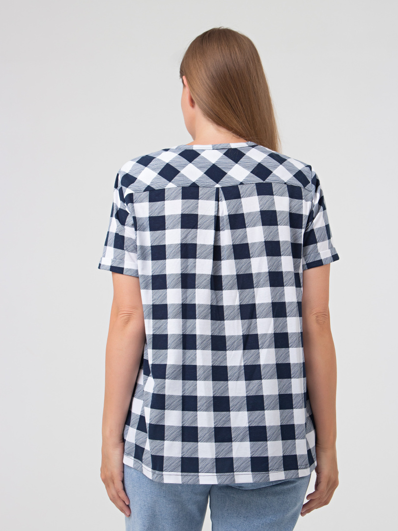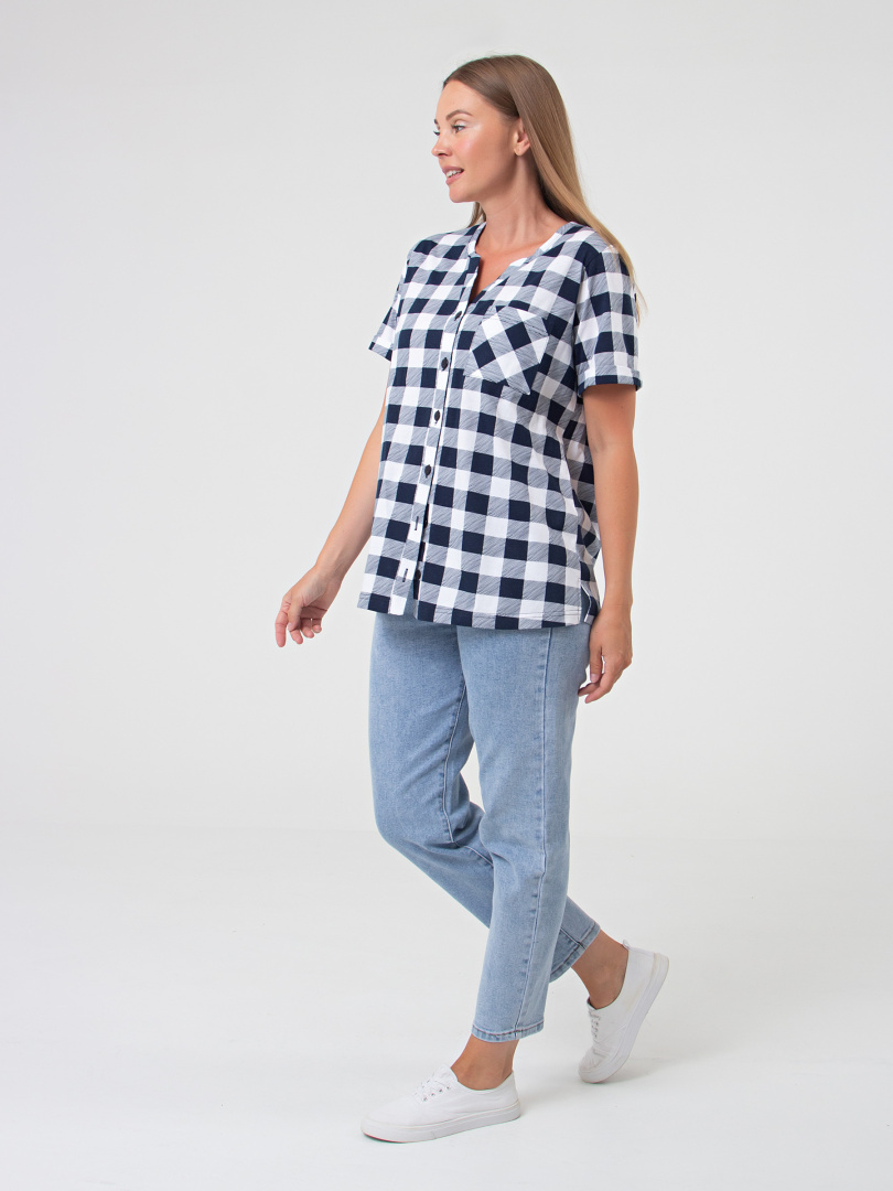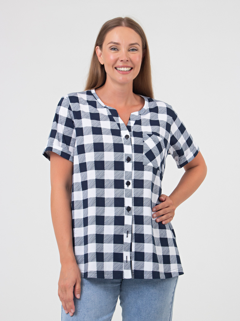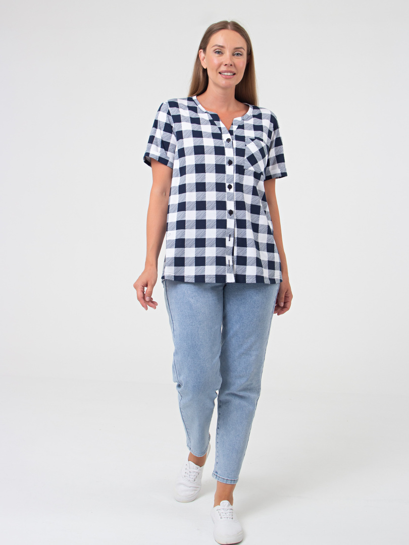 Блуза выполнена из хлопкового трикотажа. Модель прямого силуэта с боковыми разрезами. Рукава короткие втачные. Круглый вырез горловины с косой планкой, переходящей в застежку на пуговицы.
