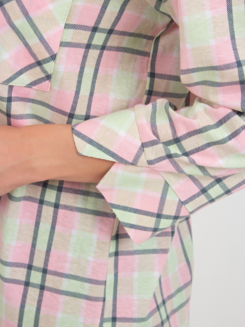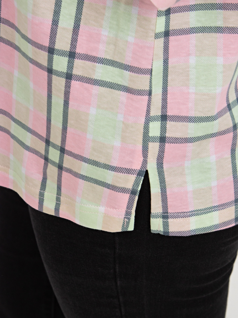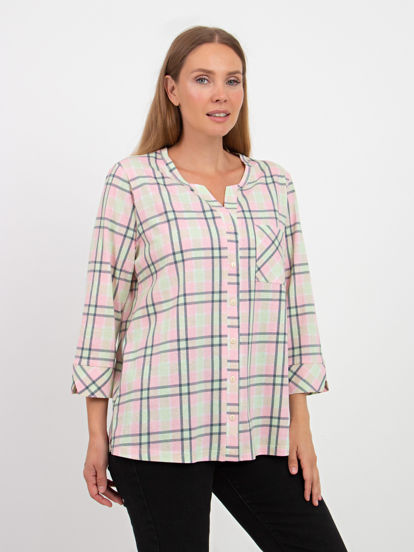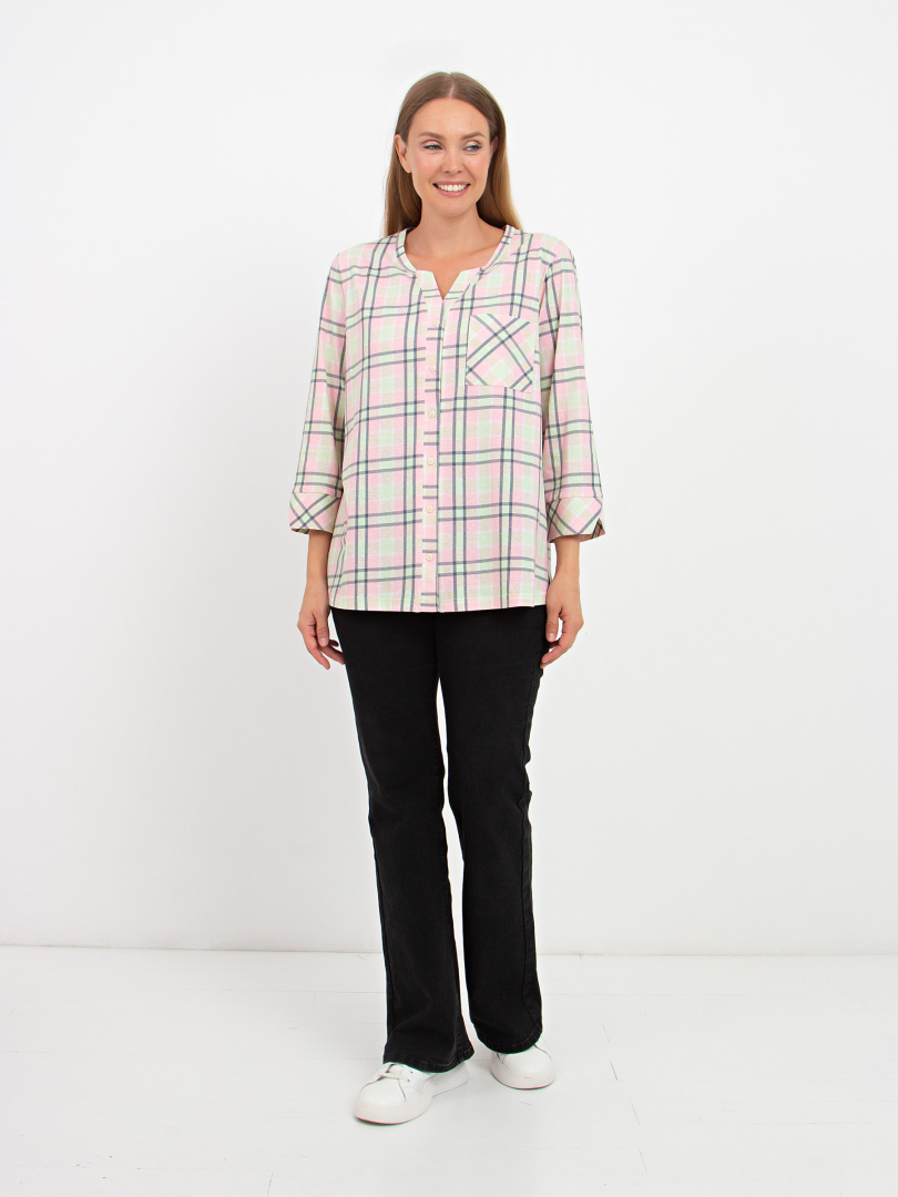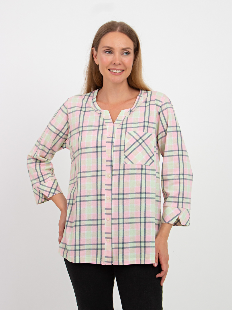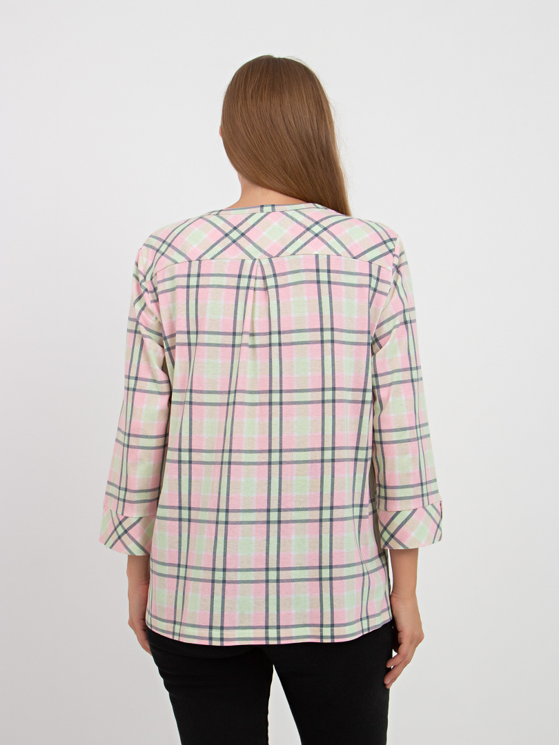 Футболка выполнена из хлопкового трикотажа. Модель прямого силуэта с разрезами по низу боковых швов. На спинке имеется кокетка со складкой. Рукава 3/4 с фигурными манжетами. Круглый вырез имеет косую планку, переходящую в застежку на пуговицы. У модели накладной карман на груди.