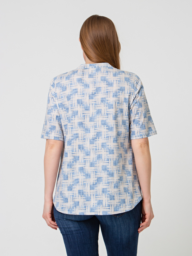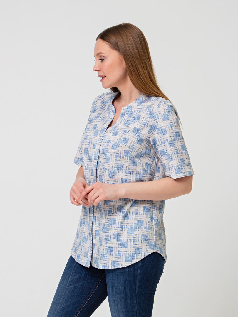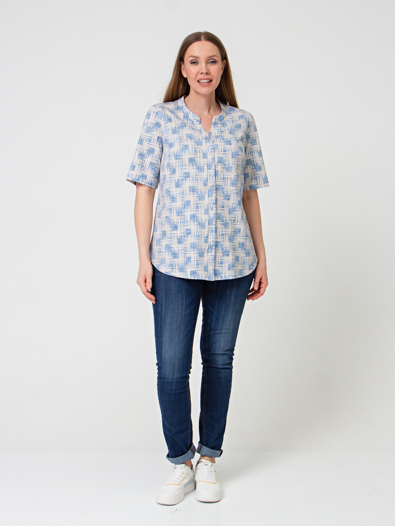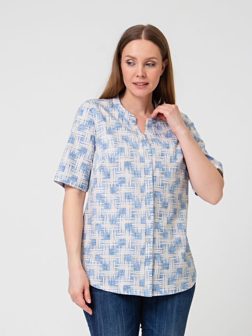 Трикотажная блуза средней длины полуприлегающего силуэта. Модель имеет короткий втачной рукав и фигурную линию низу. Вырез горловины круглый. Застёжка на косую планку.