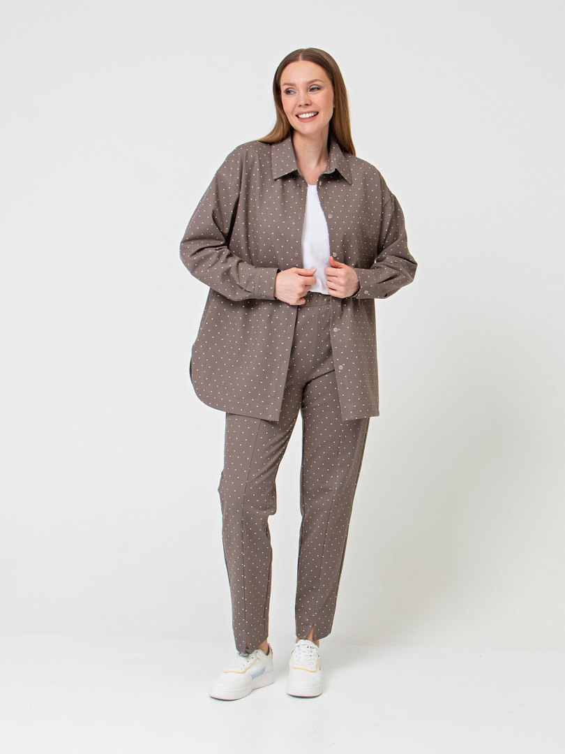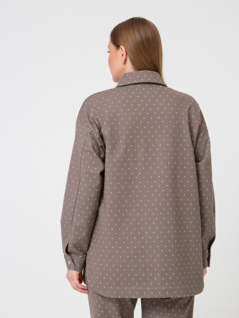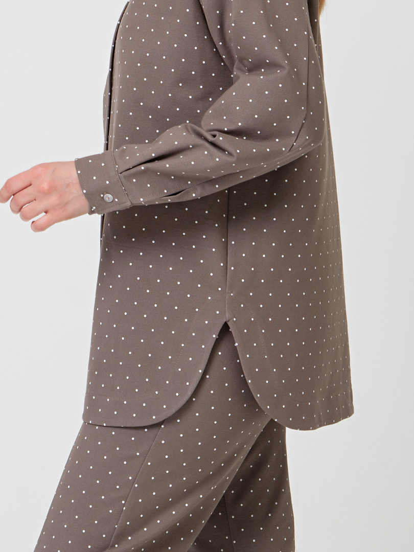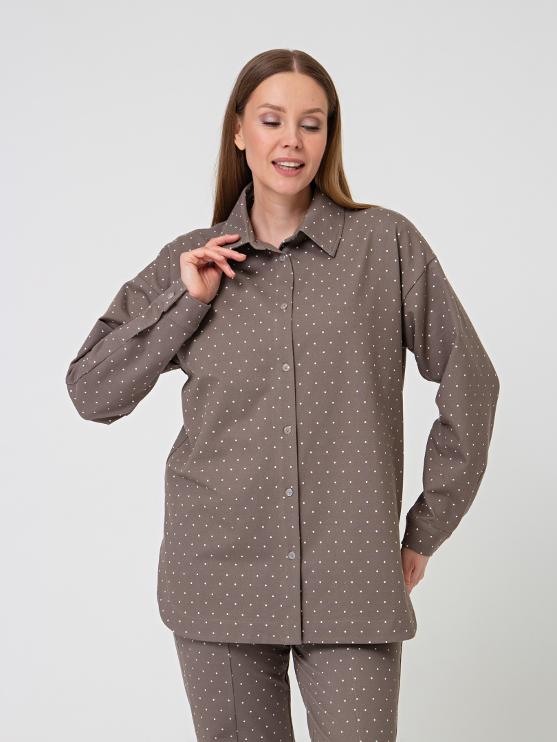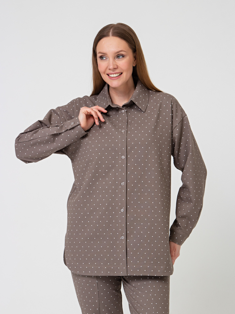 Рубашка удлиненная выполнена из текстиля. Покрой прямой свободный с длинным рукавом. Воротник рубашечного типа с отрезной стойкой. Низ рукавов – манжеты с застёжкой на петлю и пуговицу. По низу рубашка имеет закругленные по бокам края.