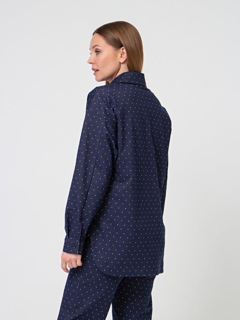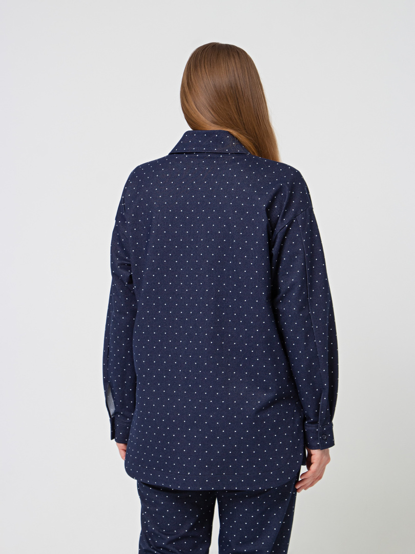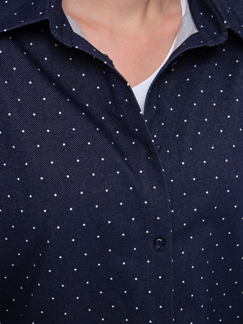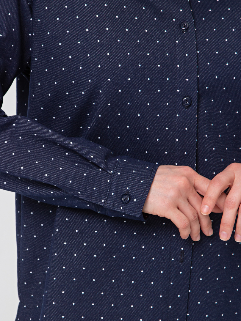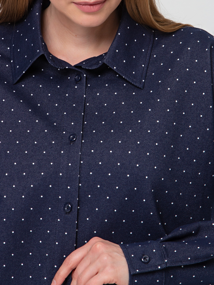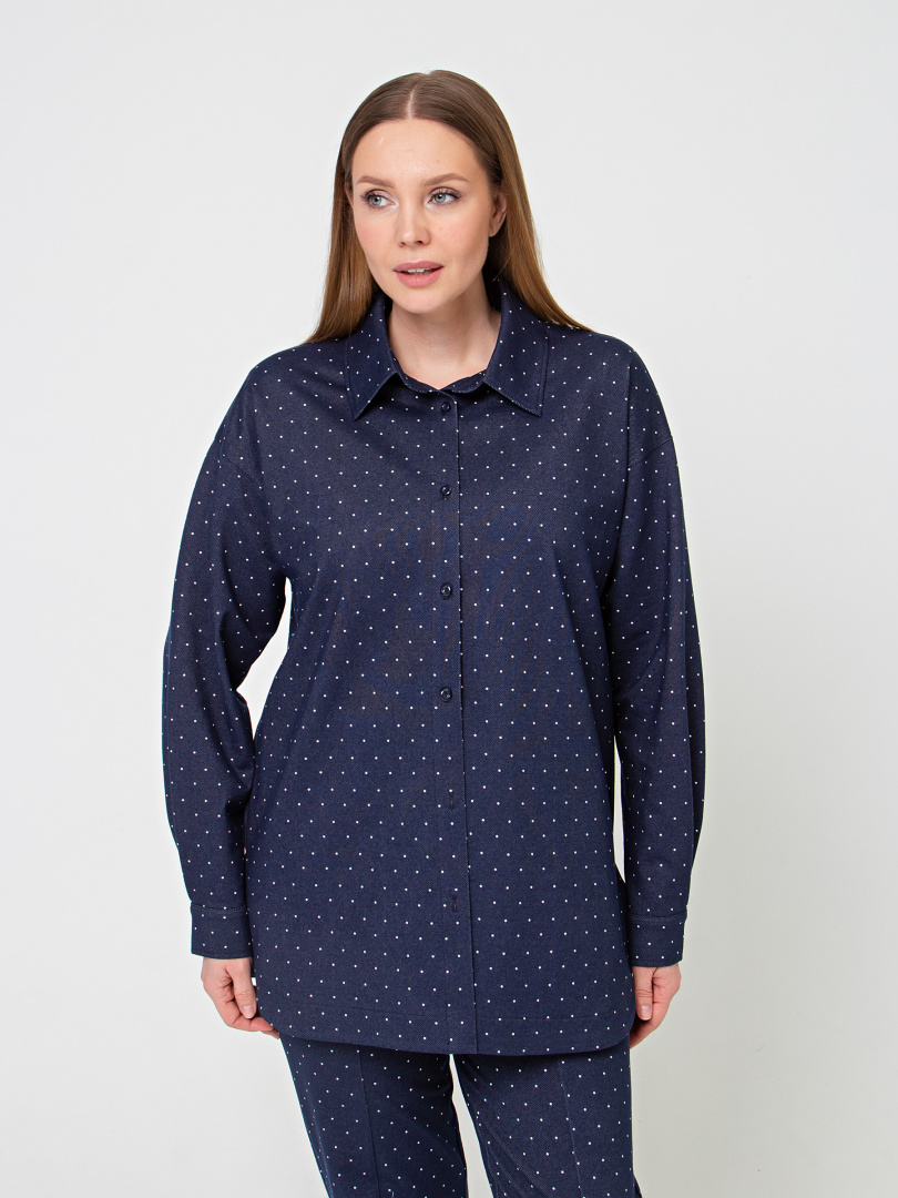 Рубашка удлиненная выполнена из текстиля. Покрой прямой свободный с длинным рукавом. Воротник рубашечного типа с отрезной стойкой. Низ рукавов – манжеты с застёжкой на петлю и пуговицу. По низу рубашка имеет закругленные по бокам края.
