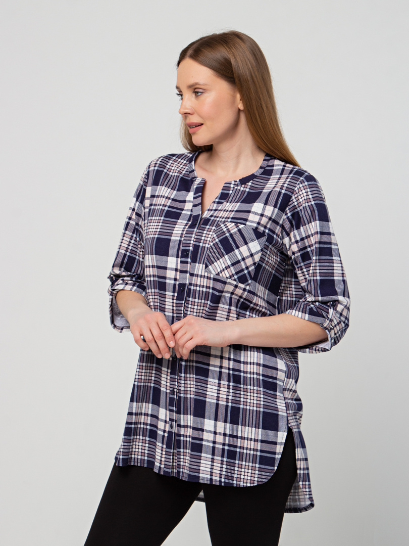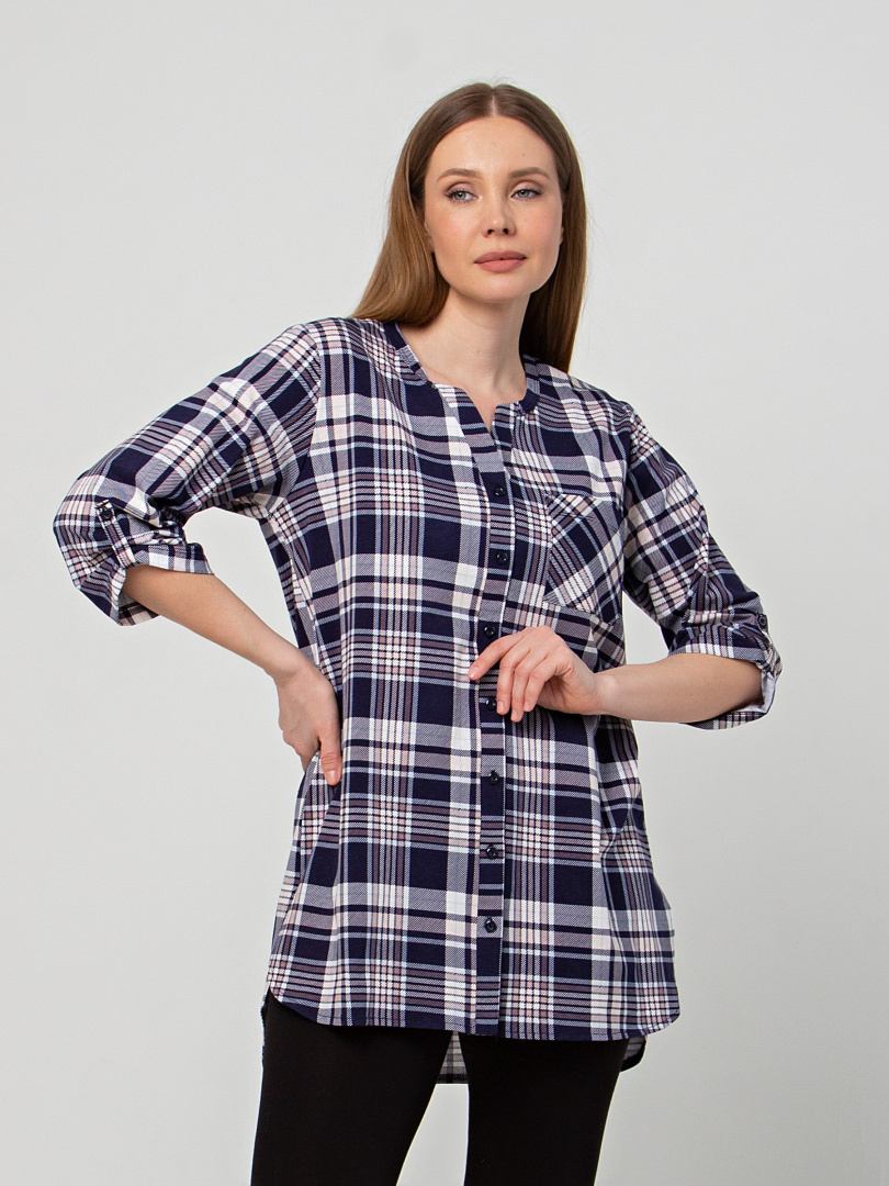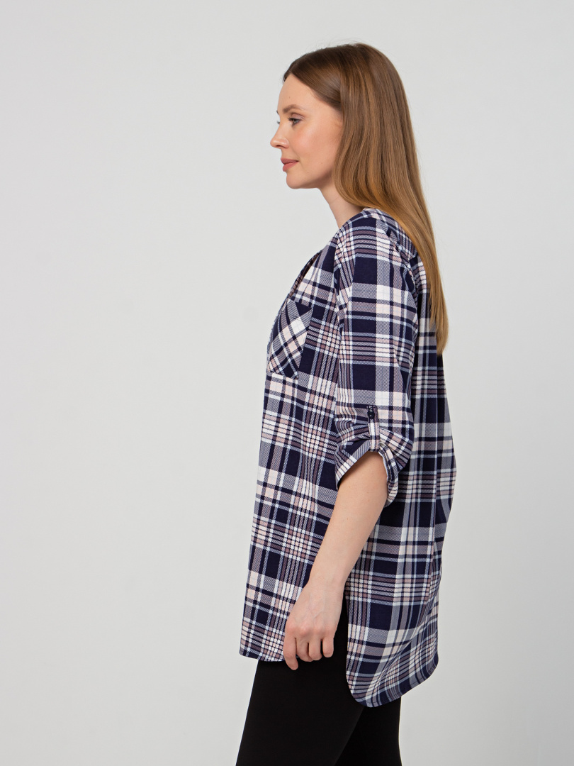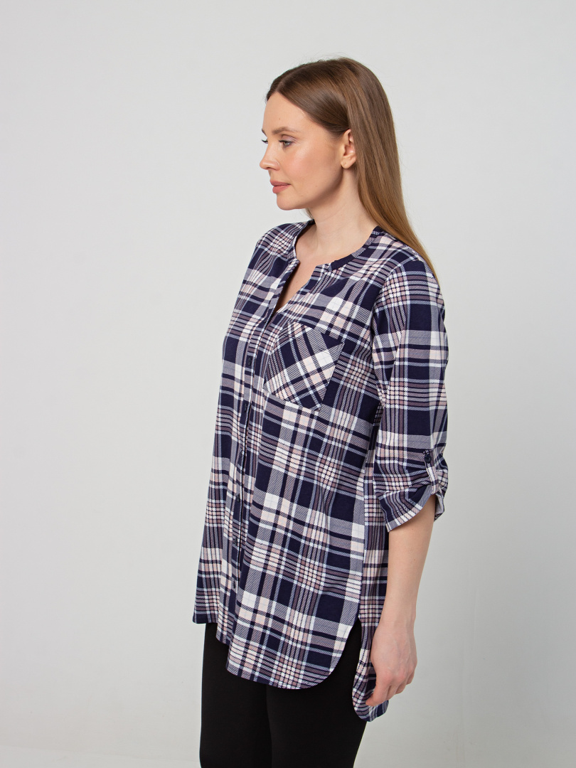 Удлиненная блуза выполнена из трикотажа. Модель прямого силуэта с фигурным низом. У модели удлиненная спинка и боковые разрезы с закругленными краями. По спинке имеется кокетка. Изделие с втачным рукавом длиной 3/4. По низу рукава – паты, застегивающиеся на пуговицу. Пата дает возможность регулировать длину рукава. Круглый вырез имеет косую планку, переходящую в застежку на пуговицы. Блуза имеет накладной кармашек на груди.