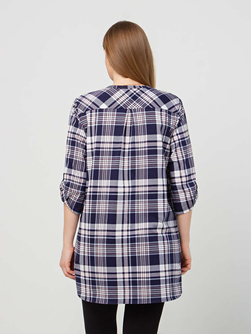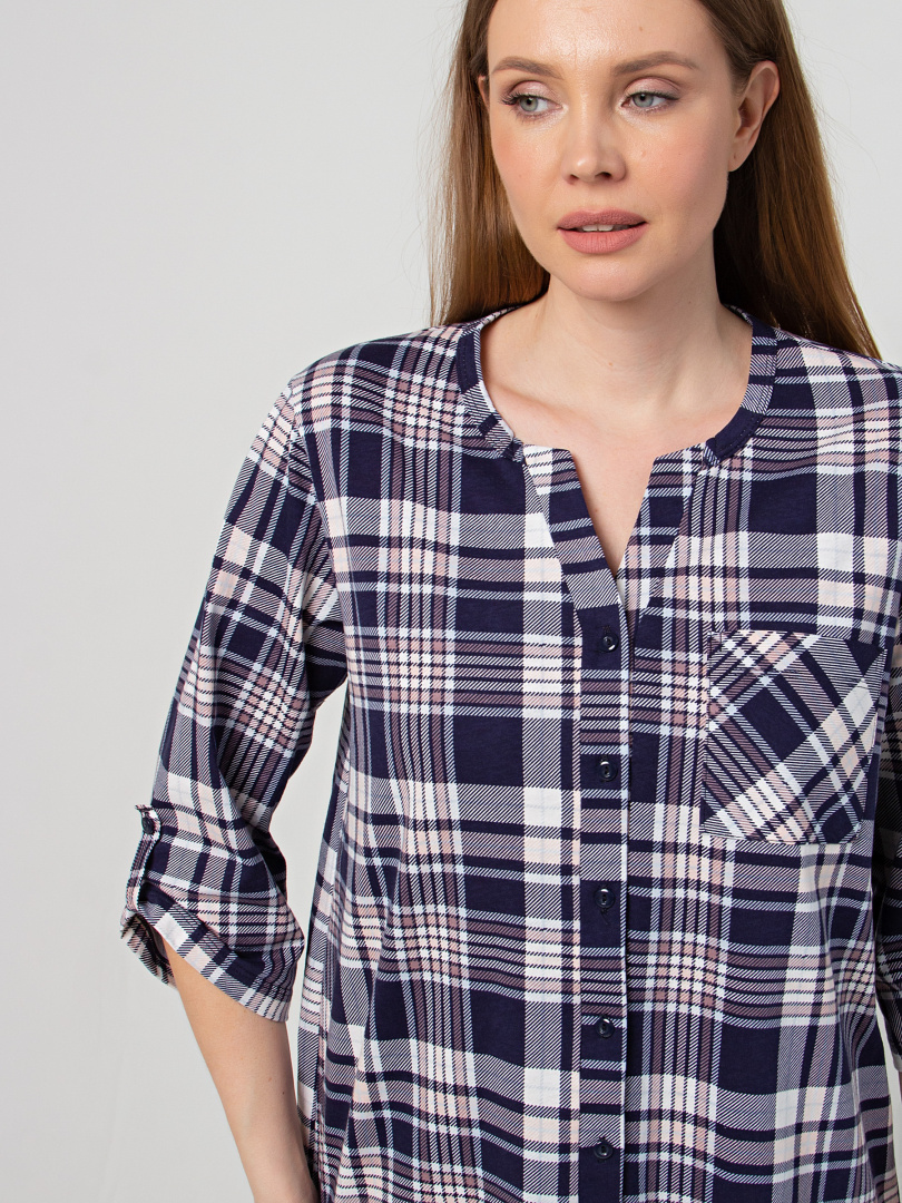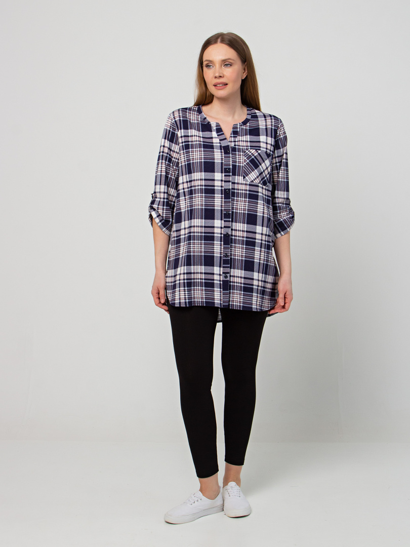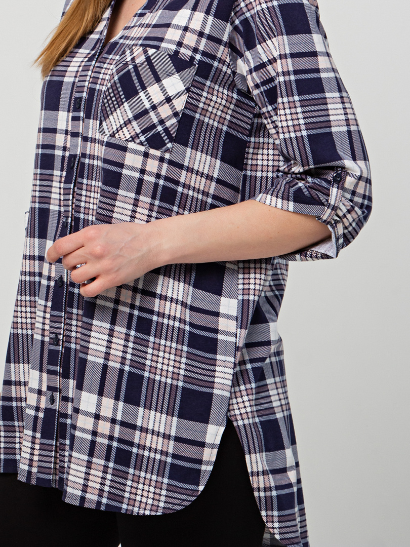 Удлиненная блуза выполнена из трикотажа. Модель прямого силуэта с фигурным низом. У модели удлиненная спинка и боковые разрезы с закругленными краями. По спинке имеется кокетка. Изделие с втачным рукавом длиной 3/4. По низу рукава – паты, застегивающиеся на пуговицу. Пата дает возможность регулировать длину рукава. Круглый вырез имеет косую планку, переходящую в застежку на пуговицы. Блуза имеет накладной кармашек на груди.