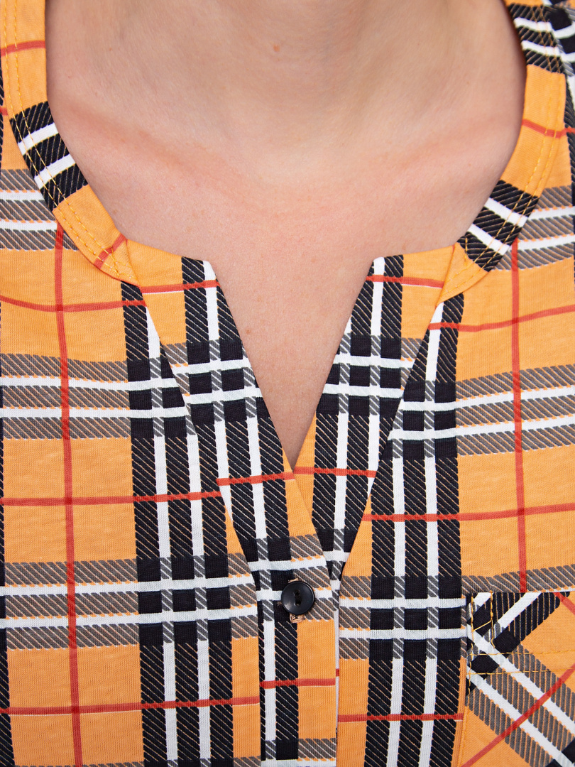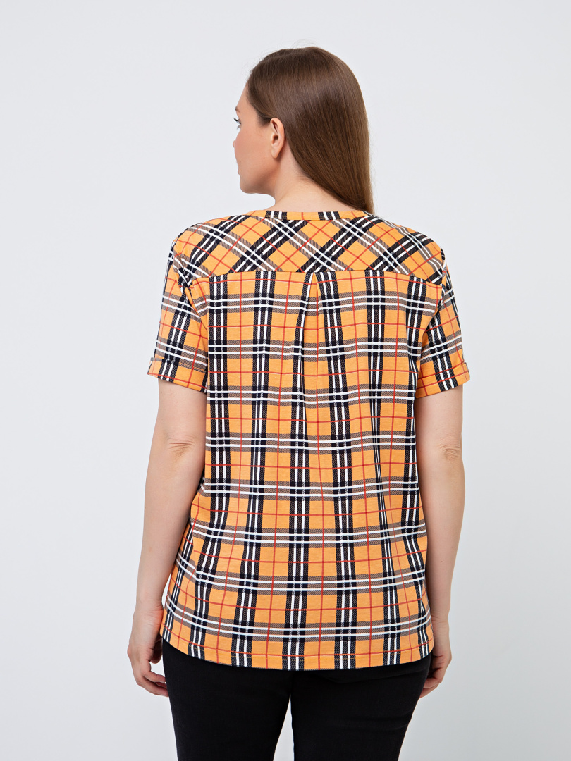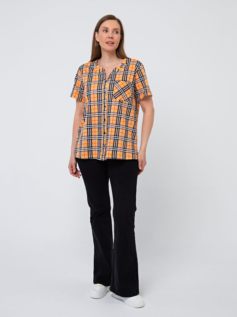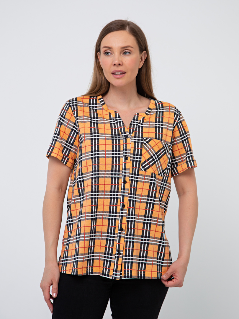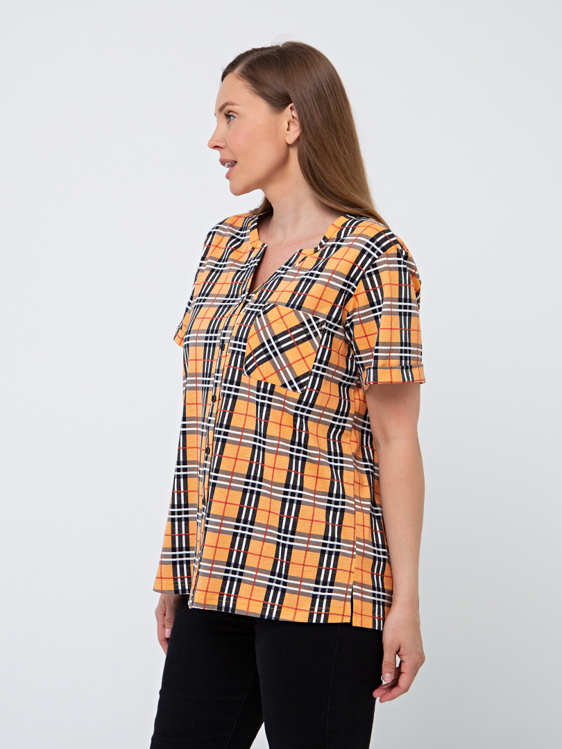 Блуза выполнена из хлопкового трикотажа. Модель прямого силуэта с боковыми разрезами. Рукава короткие втачные. Круглый вырез горловины с косой планкой, переходящей в застежку на пуговицы.