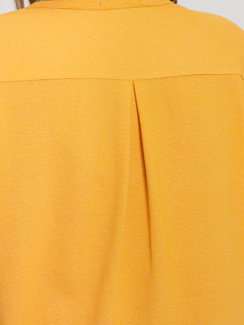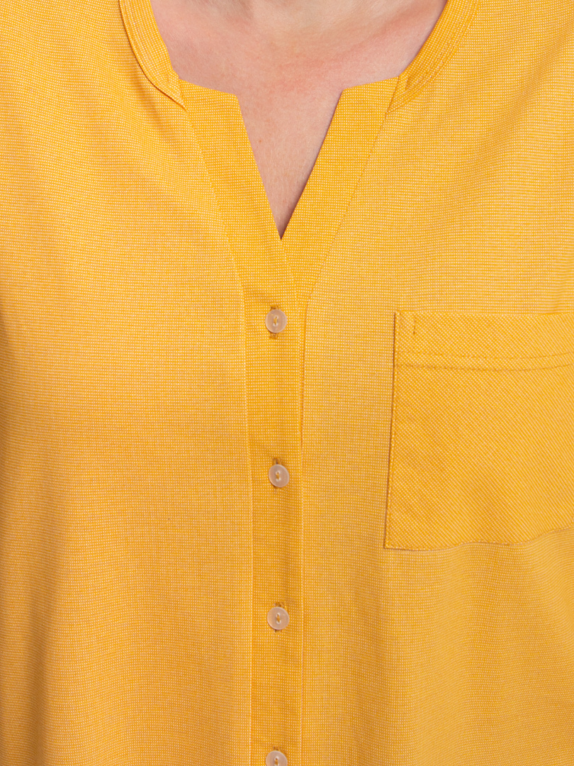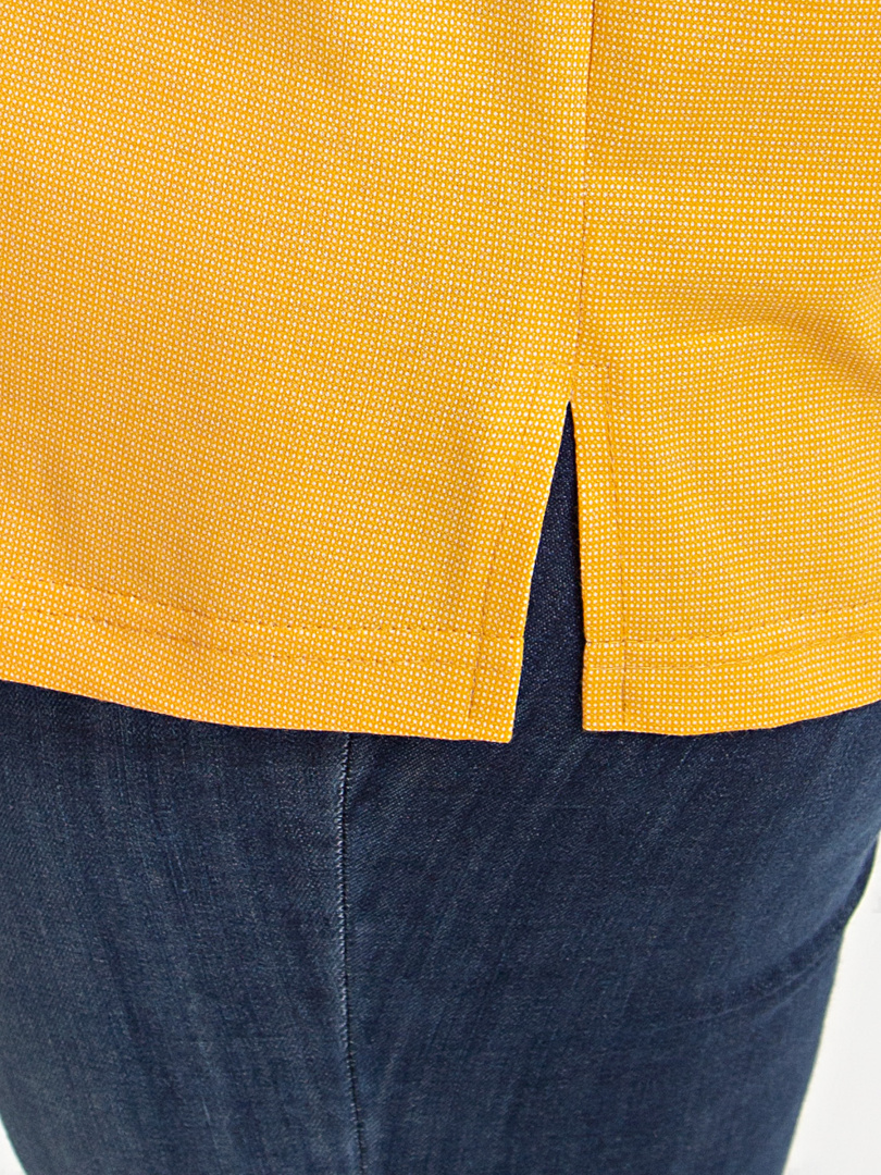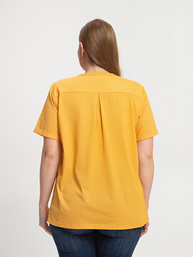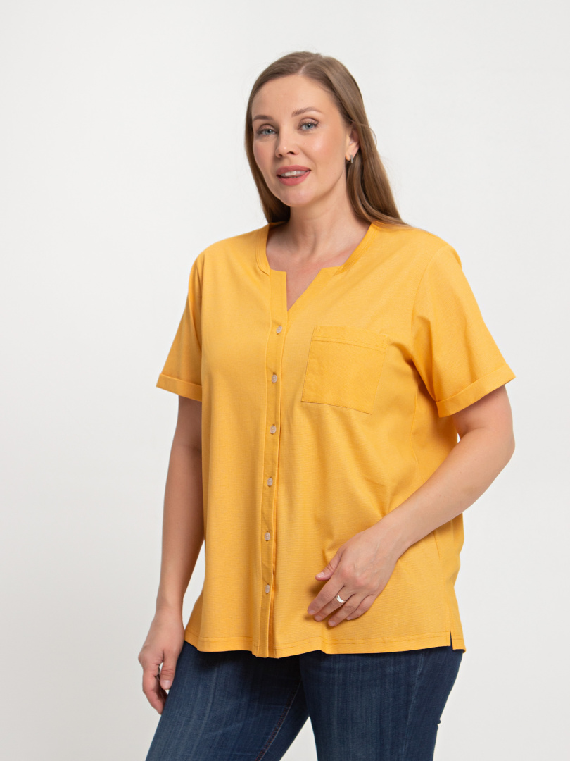Блуза выполнена из хлопкового трикотажа. Модель прямого силуэта с боковыми разрезами. Рукава короткие втачные. Круглый вырез горловины с косой планкой, переходящей в застежку на пуговицы.