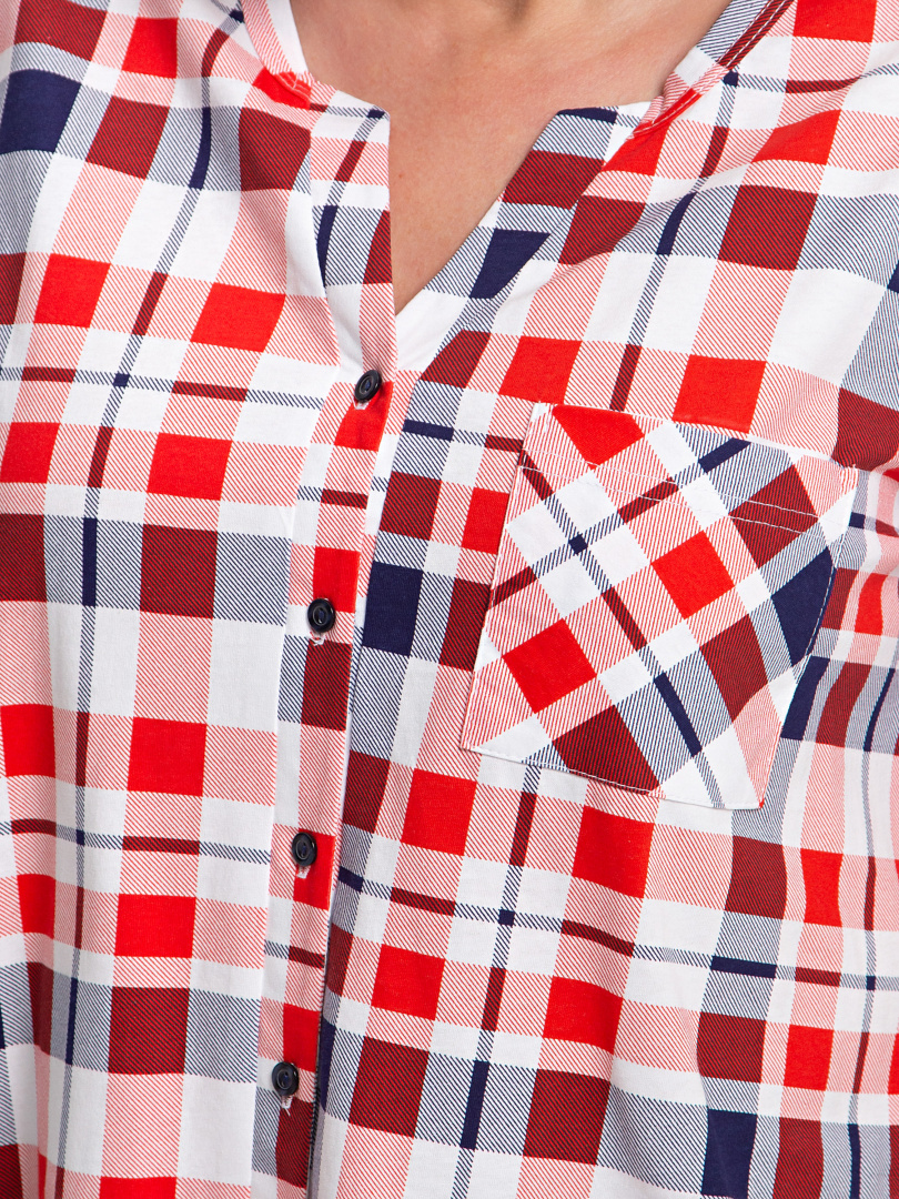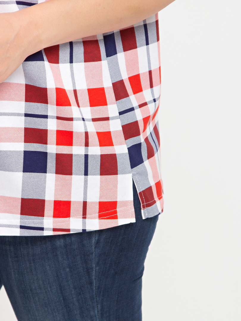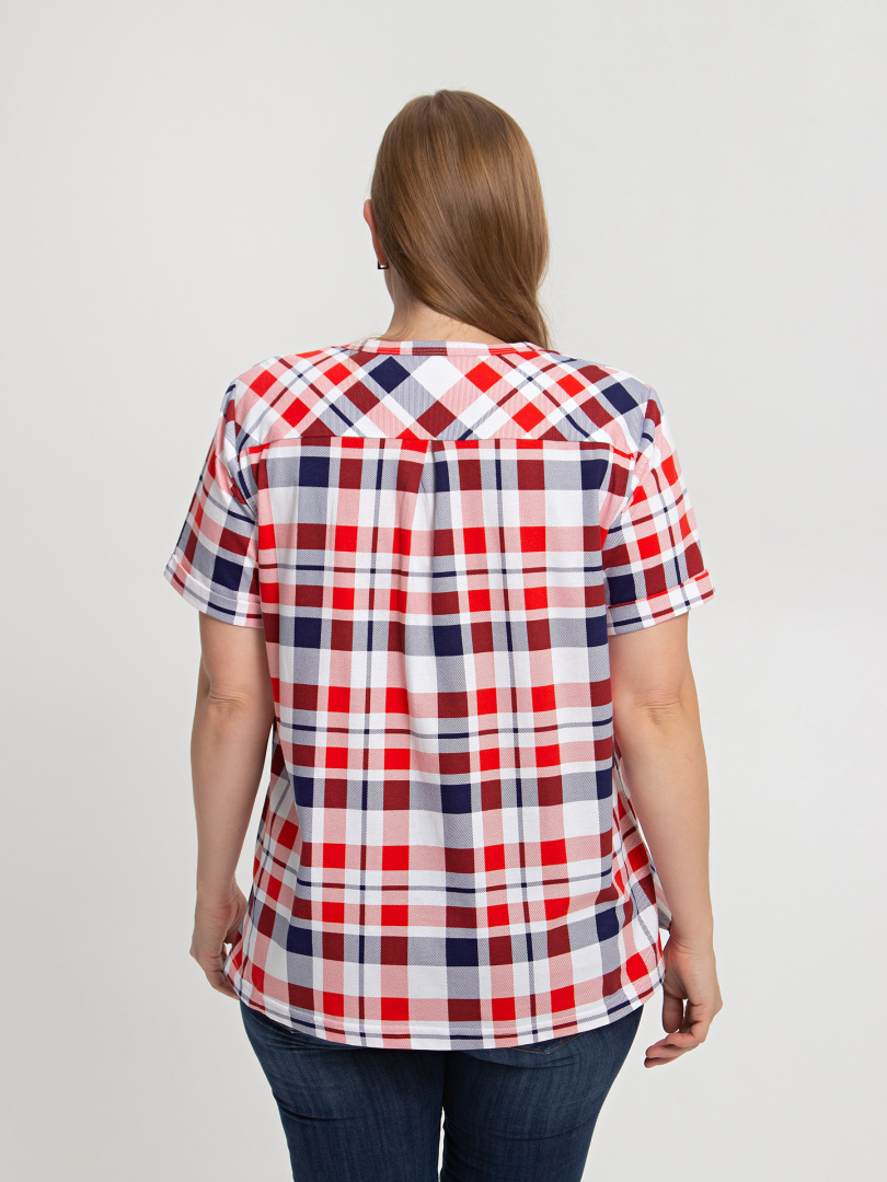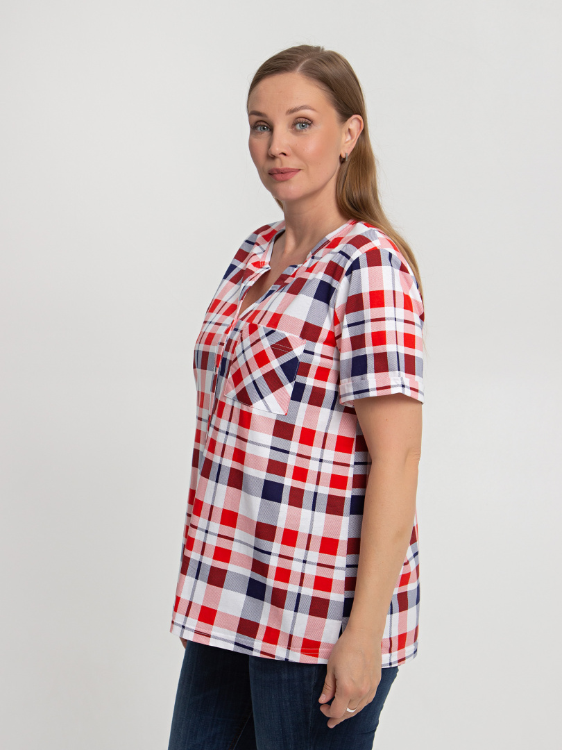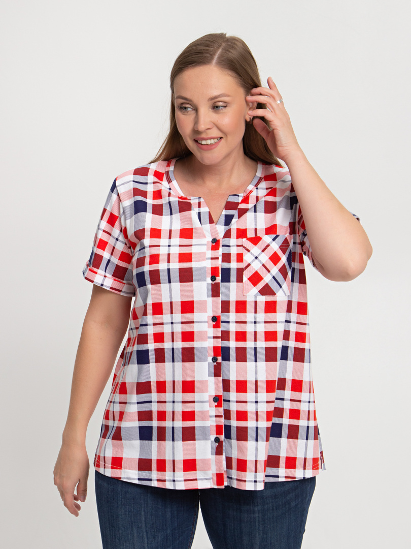 Блуза выполнена из хлопкового трикотажа. Модель прямого силуэта с боковыми разрезами. Рукава короткие втачные. Круглый вырез горловины с косой планкой, переходящей в застежку на пуговицы.