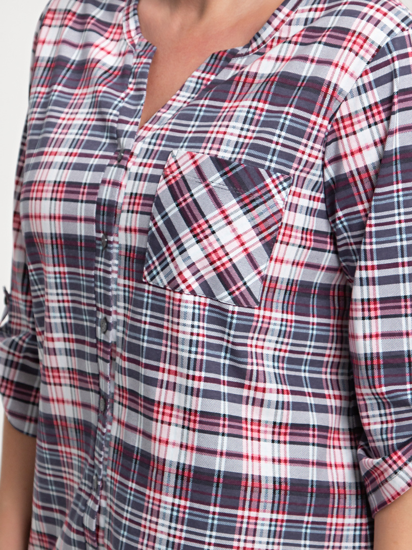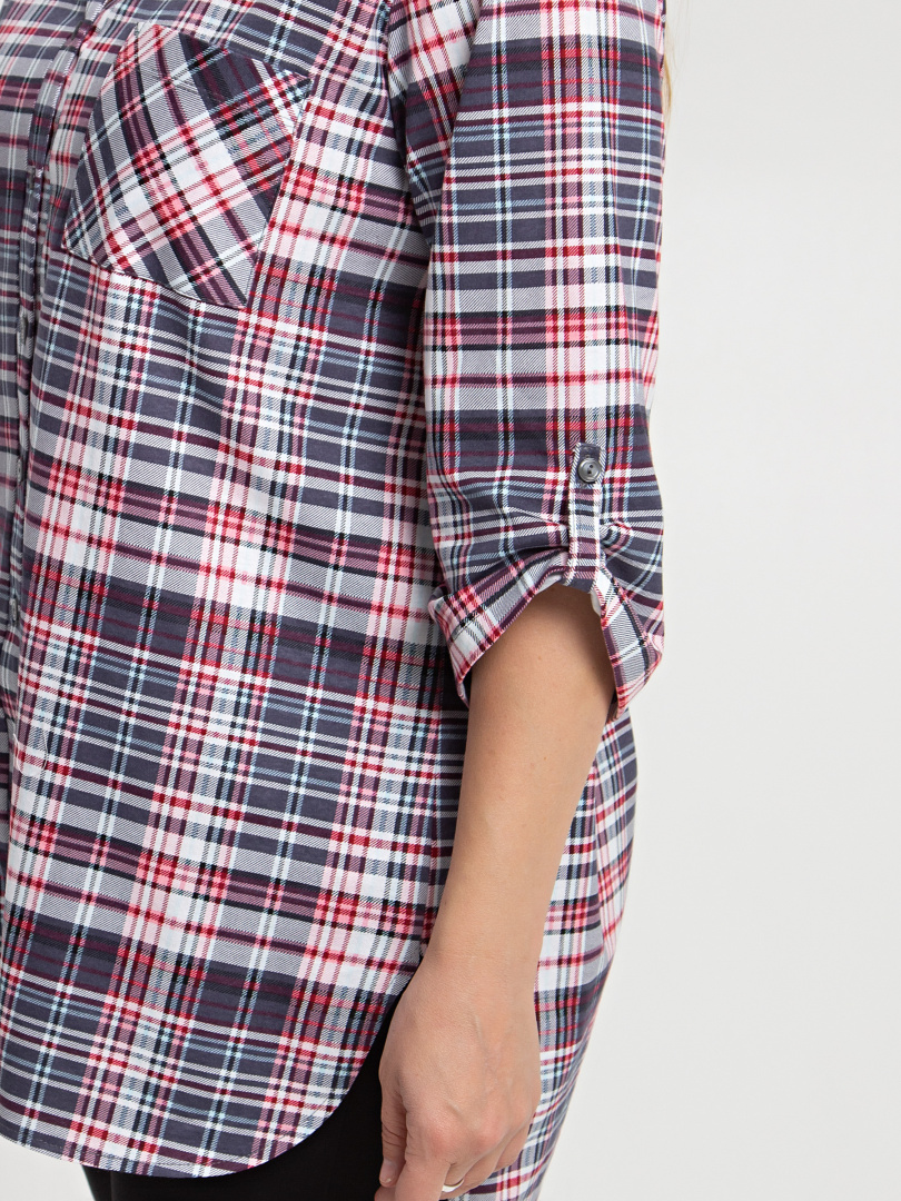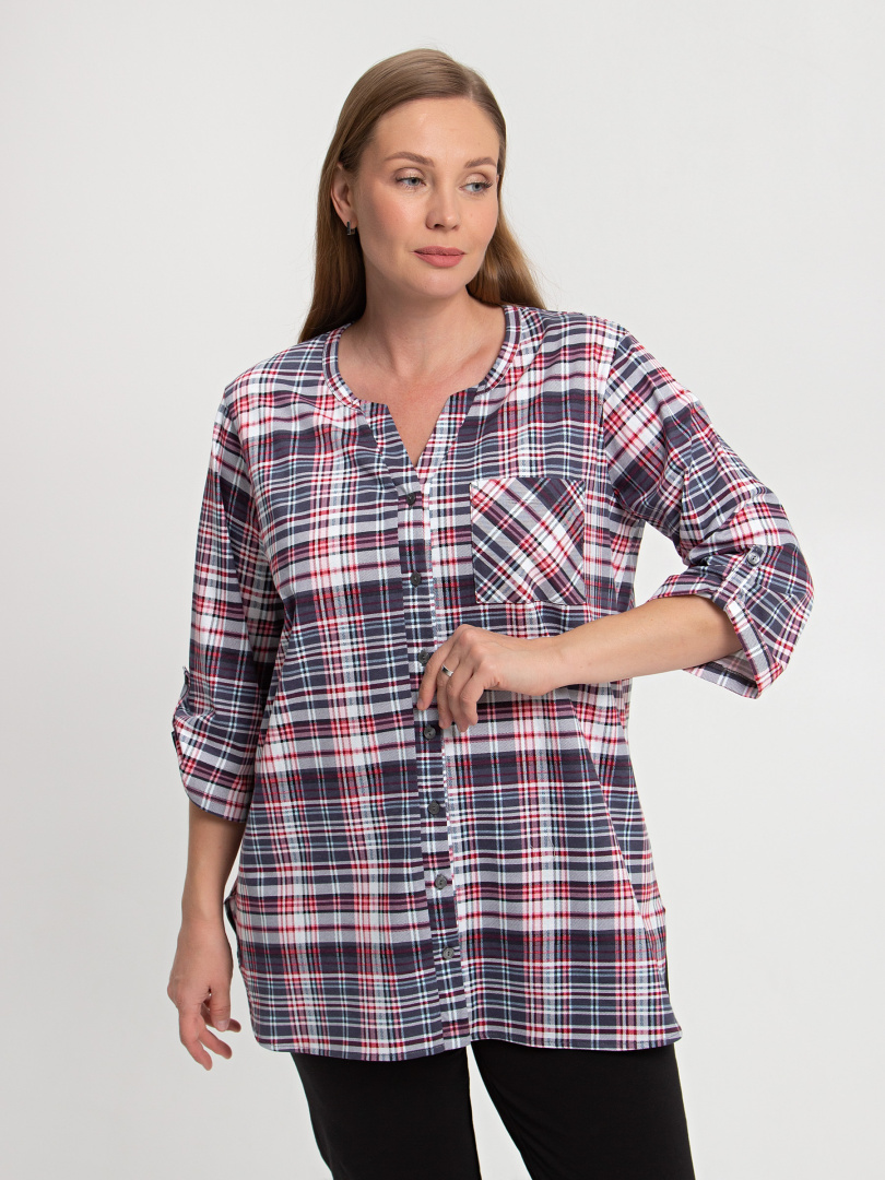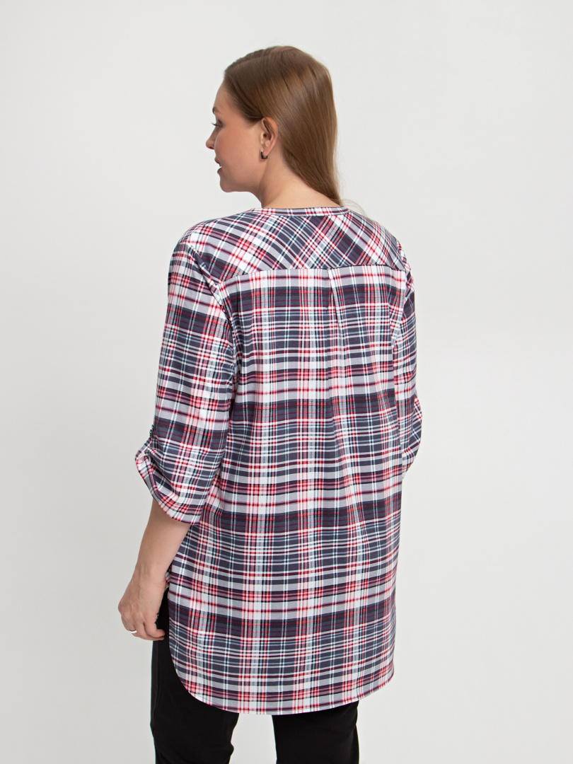 Удлиненная блуза выполнена из трикотажа. Модель прямого силуэта с фигурным низом. У  модели  удлиненная спинка и боковые разрезы с закругленными краями. По спинке имеется кокетка. Изделие с втачным  рукавом  длиной 3/4. По низу рукава – паты, застегивающиеся на пуговицу. Пата дает возможность регулировать длину рукава. Круглый вырез имеет косую планку, переходящую в застежку на пуговицы. Блуза имеет накладной кармашек на груди.