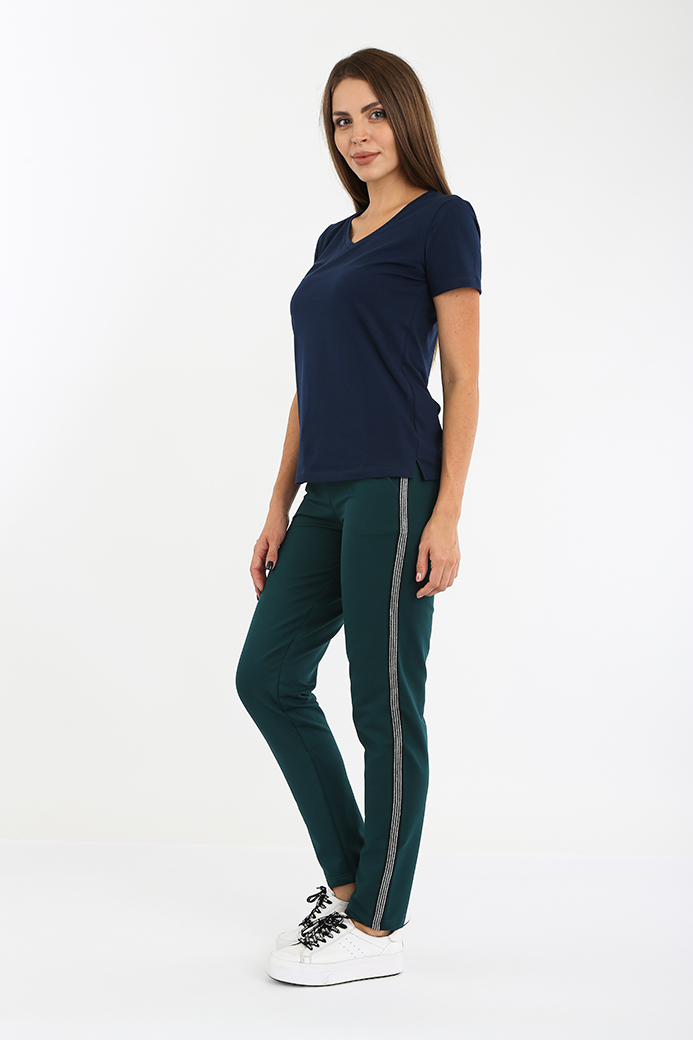 Длинные брюки из плотного трикотажа с лампасом. Модель средней посадки прямого покроя зауженная книзу. Притачной пояс с широкой резинкой и шнуром. На передних половинках боковые карманы с наклонным входом.