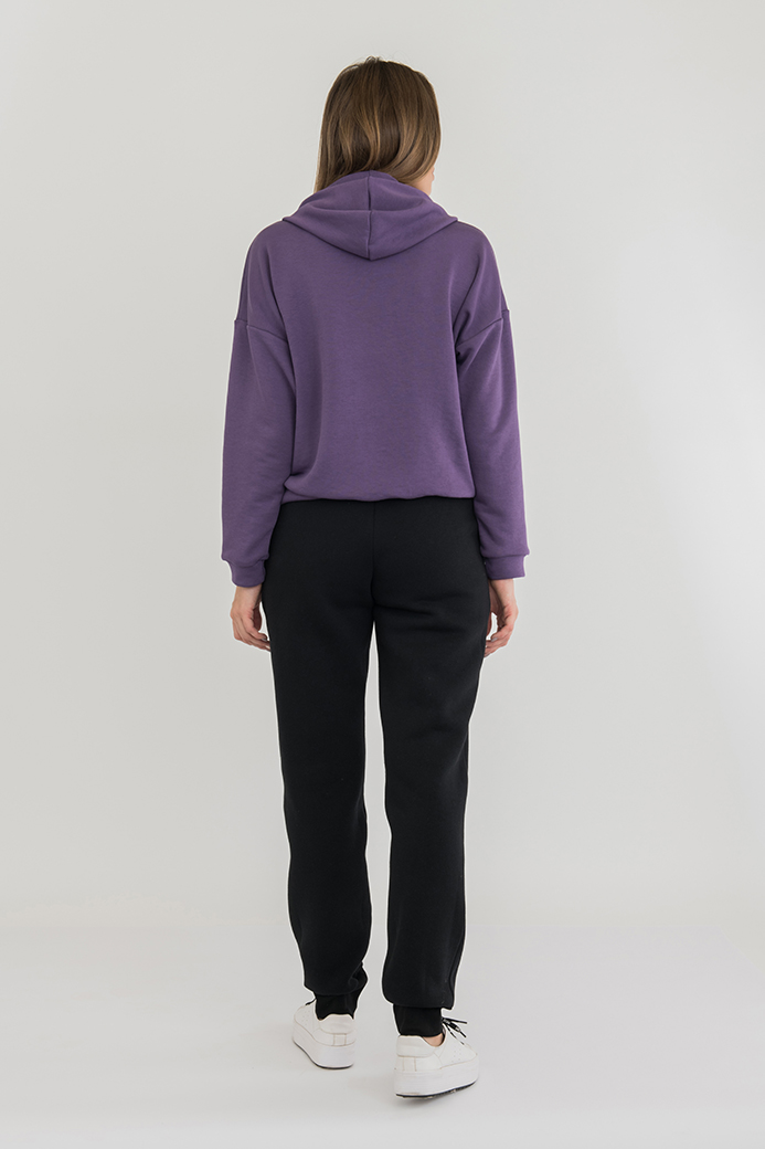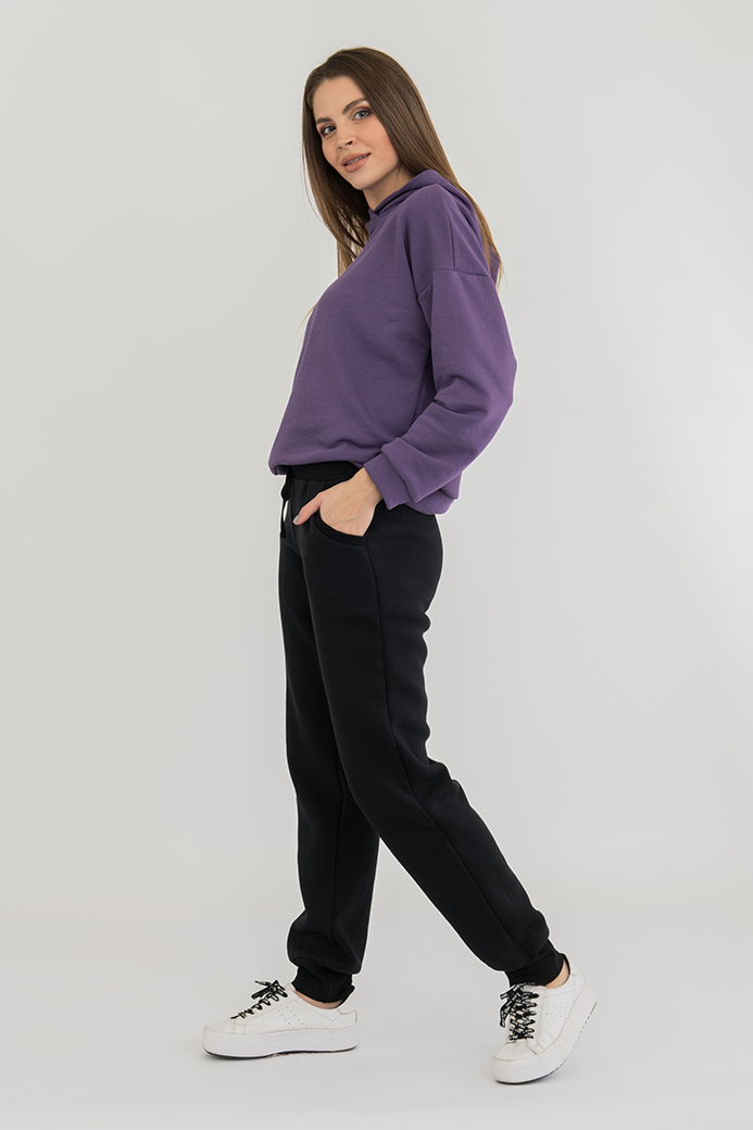 Длинные брюки на манжете из плотного трикотажа с начесом. Модель прямого покроя на манжете по низу. Притачной пояс с широкой резинкой и шнуром. На передних половинках - боковые карманы .