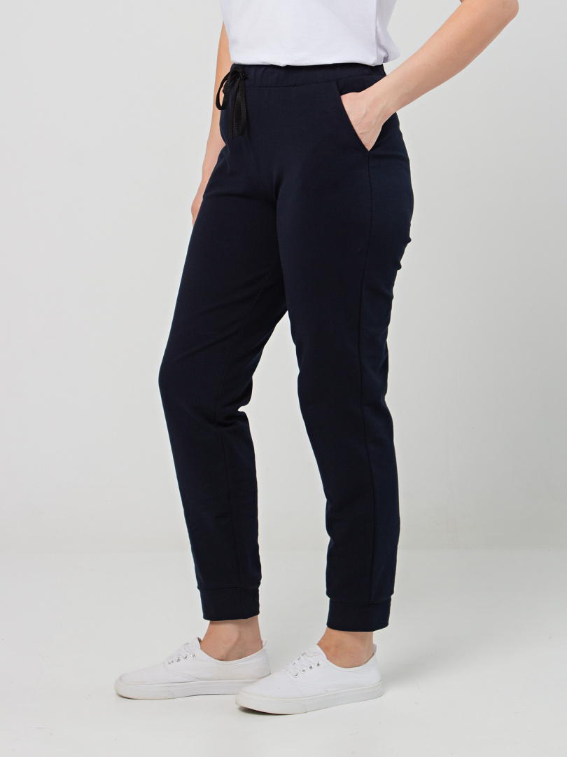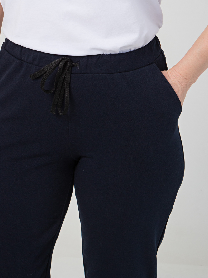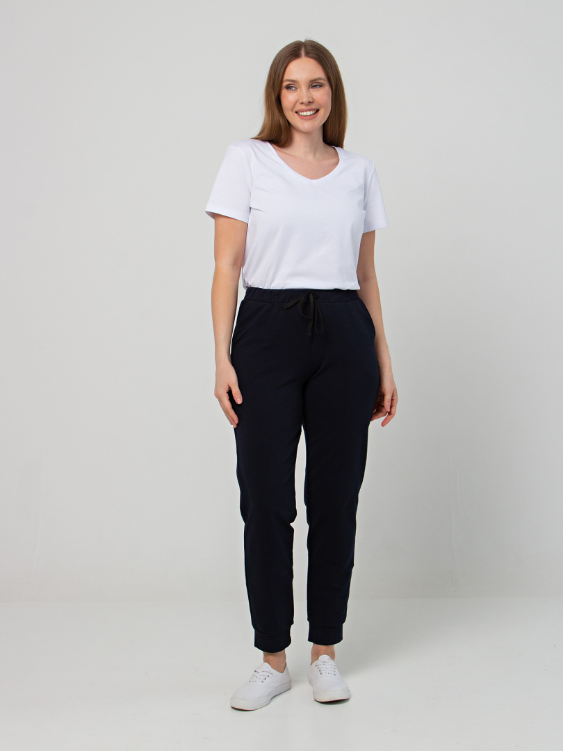 Длинные брюки из плотного трикотажа. Модель средней посадки прямого покроя слегка заужена книзу. Притачной пояс с широкой резинкой и шнуром. На передних половинках боковые карманы с наклонным входом.