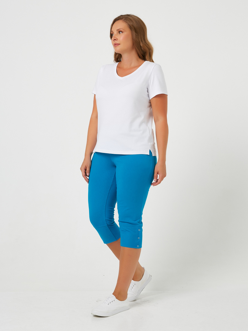Трикотажные малообъёмные бриджи длиной до середины икры. Модель прямого покроя слегка заужена книзу. По низу – широкие притачные манжеты с застёжкой на 3 кнопки. Пояс - на резинке.