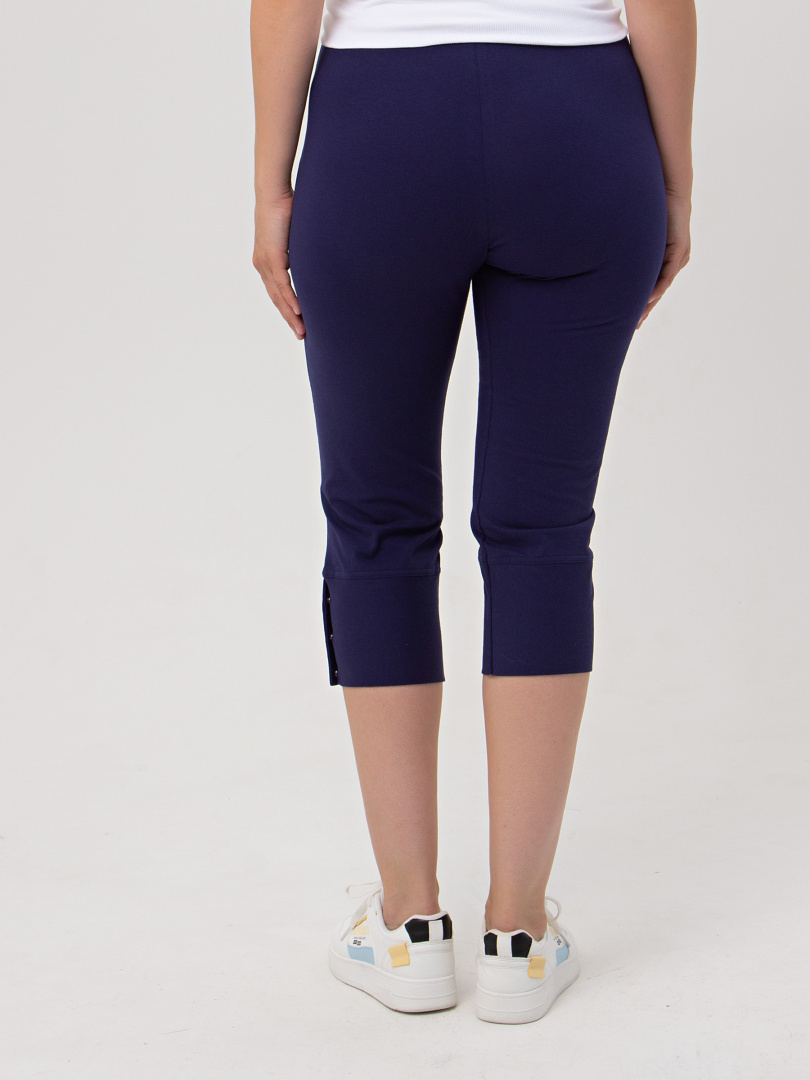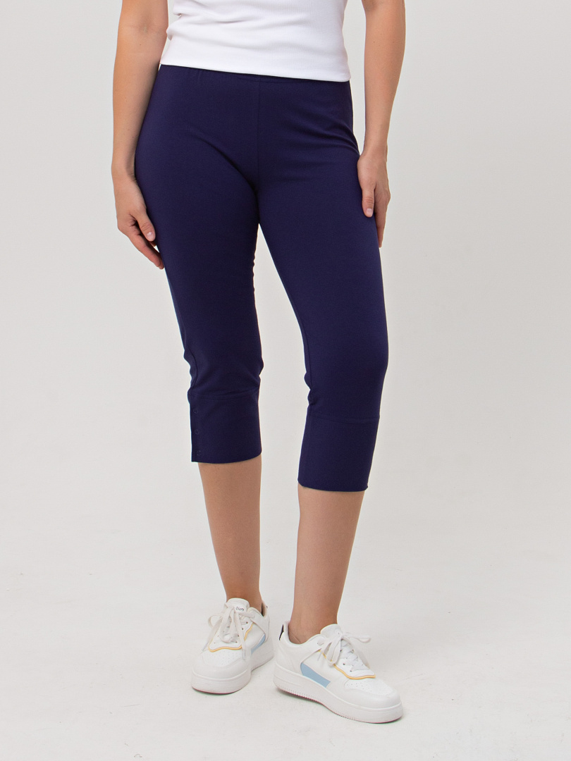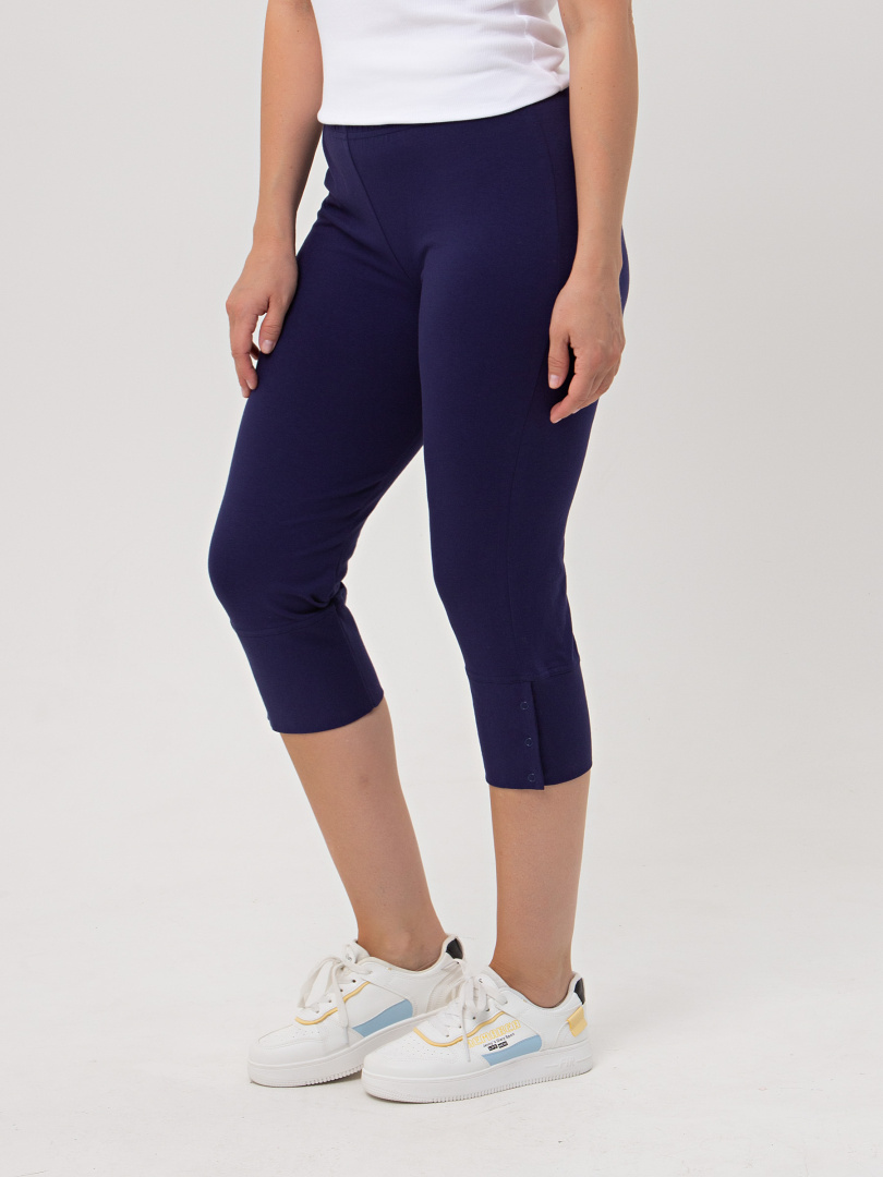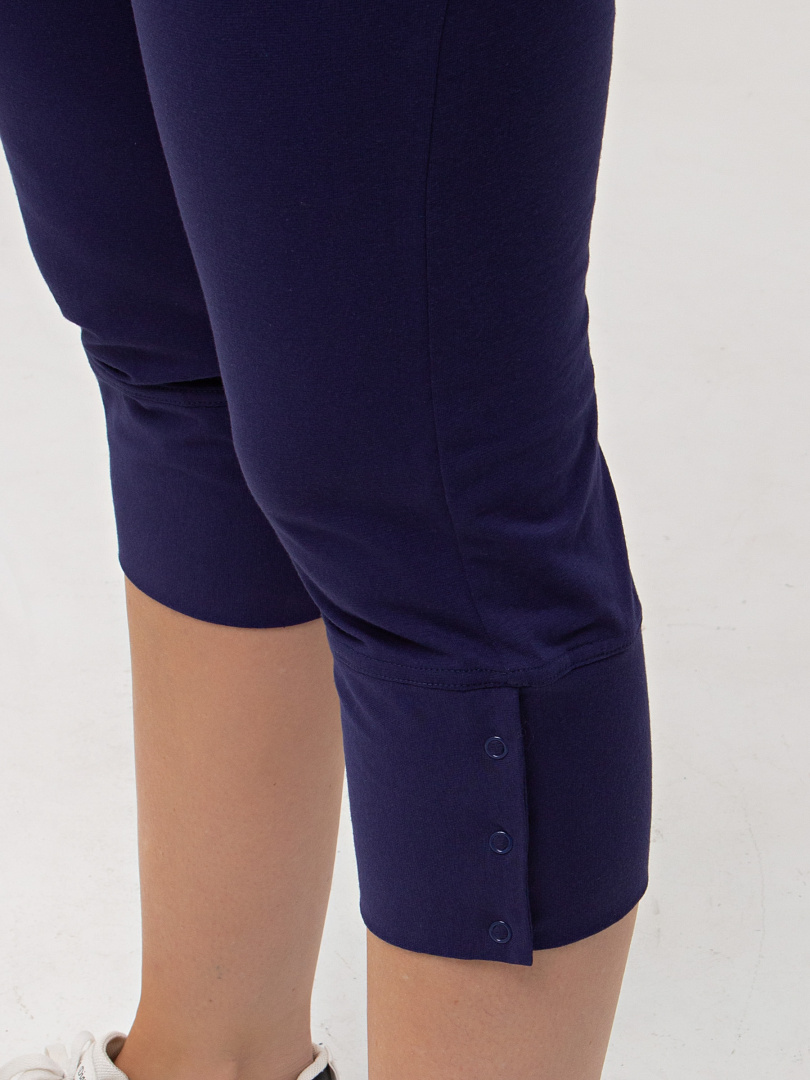 Трикотажные малообъёмные бриджи длиной до середины икры. Модель прямого покроя слегка заужена книзу. По низу – широкие притачные манжеты с застёжкой на 3 кнопки. Пояс - на резинке.