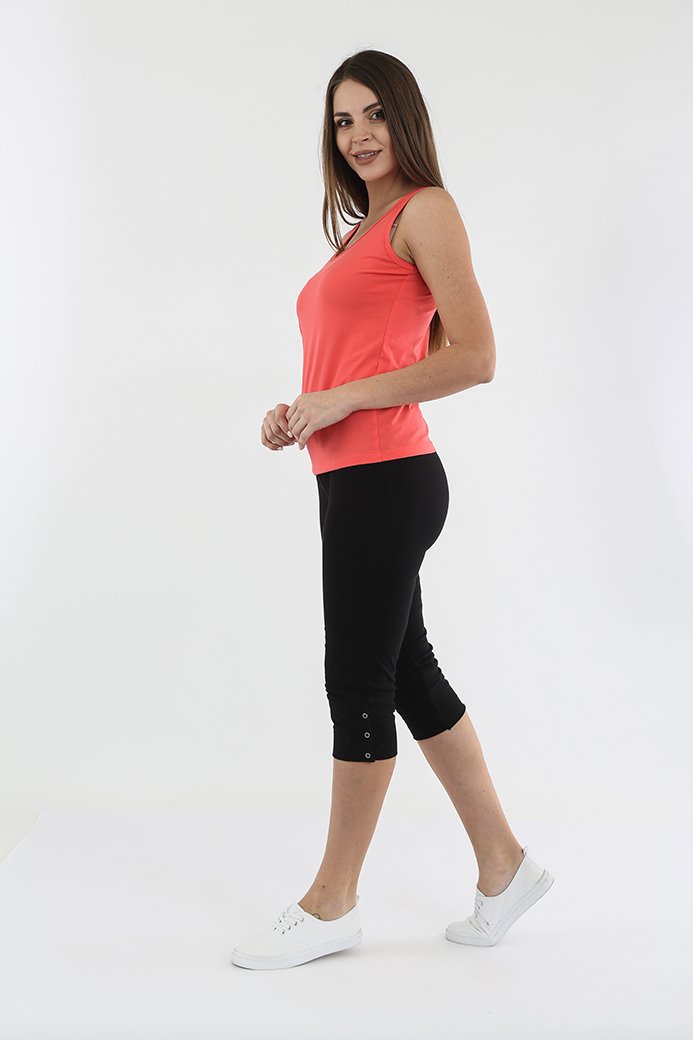Трикотажные малообъёмные бриджи длиной до середины икры. Модель прямого покроя слегка заужена книзу. По низу – широкие притачные манжеты с застёжкой на 3 кнопки. Пояс - на резинке.