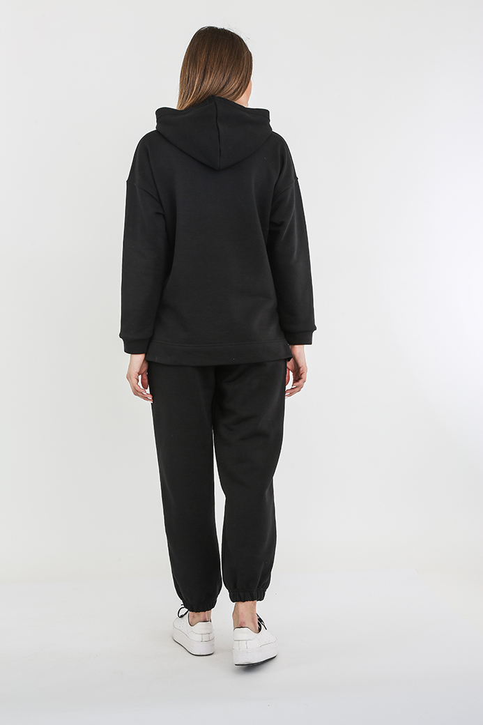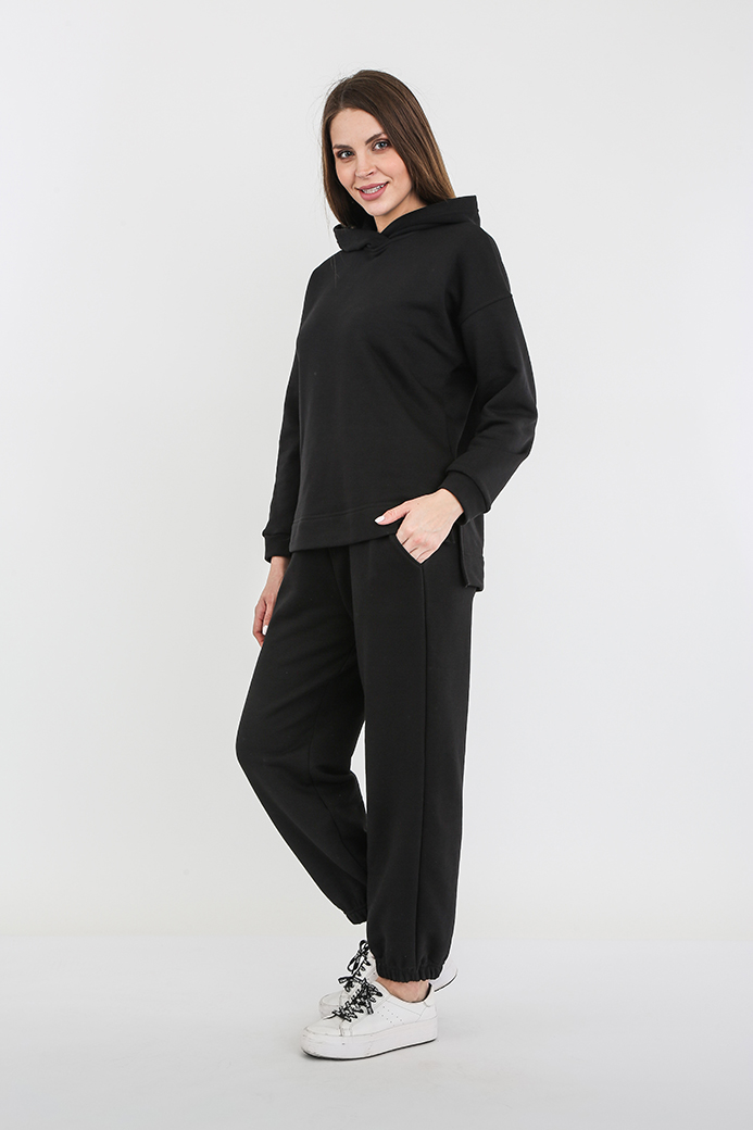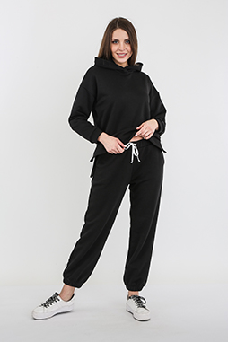 Брюки-джогеры из плотного трикотажа. Модель свободного покроя на резине по низу брюк. Притачной пояс с широкой резинкой и шнуром. На передних половинках боковые карманы с наклонным входом. Современные стильные брюки как для дома, так и для прогулок.