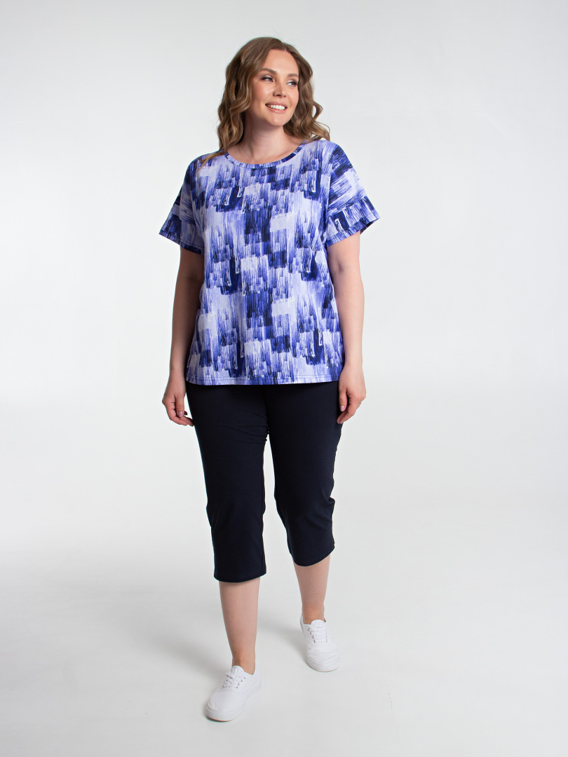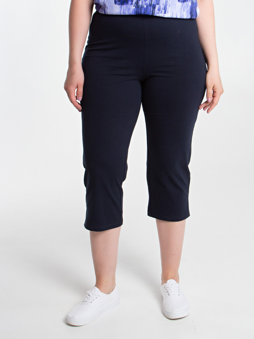 Трикотажные малообъёмные бриджи длиной до середины икры. Модель прямого покроя слегка заужена книзу. По боковым швам – небольшие разрезы. Пояс - на резинке.