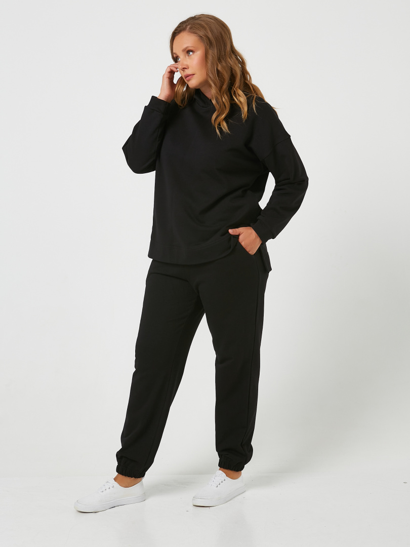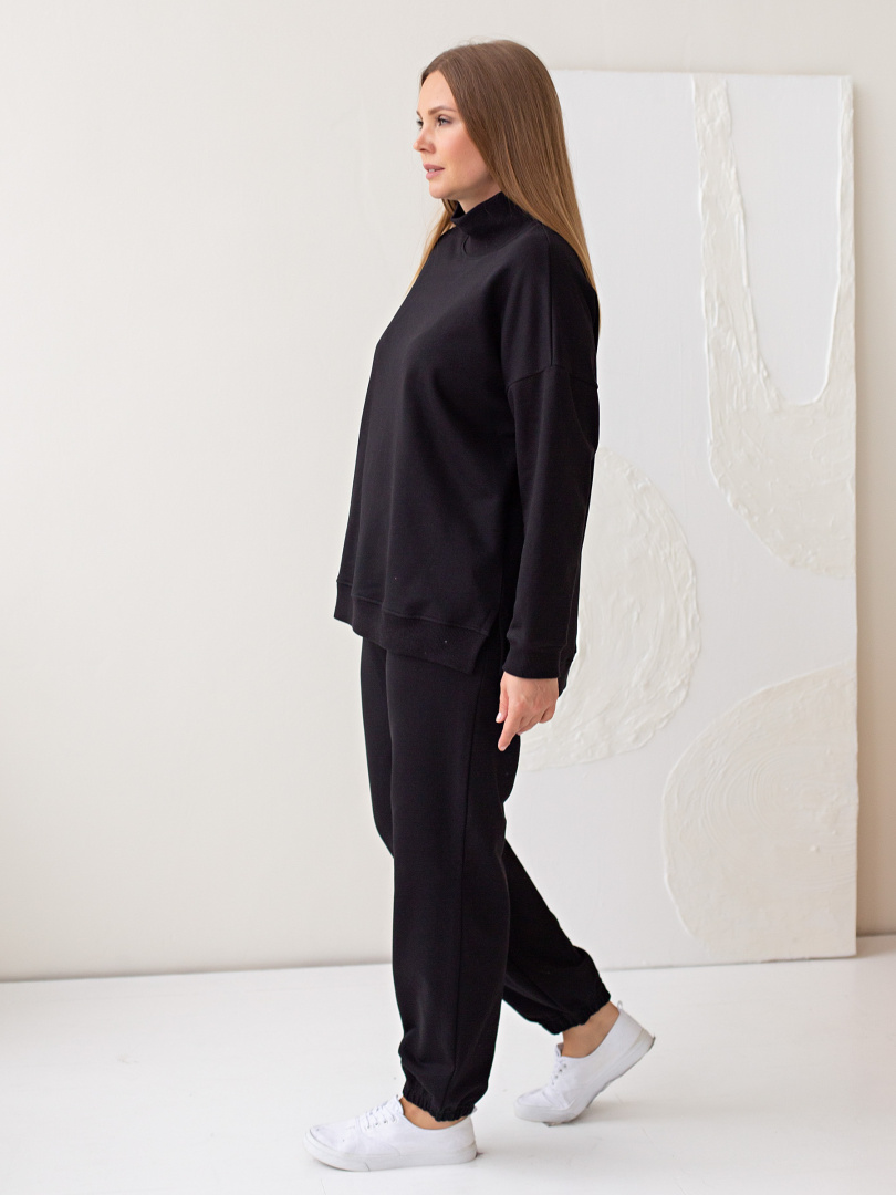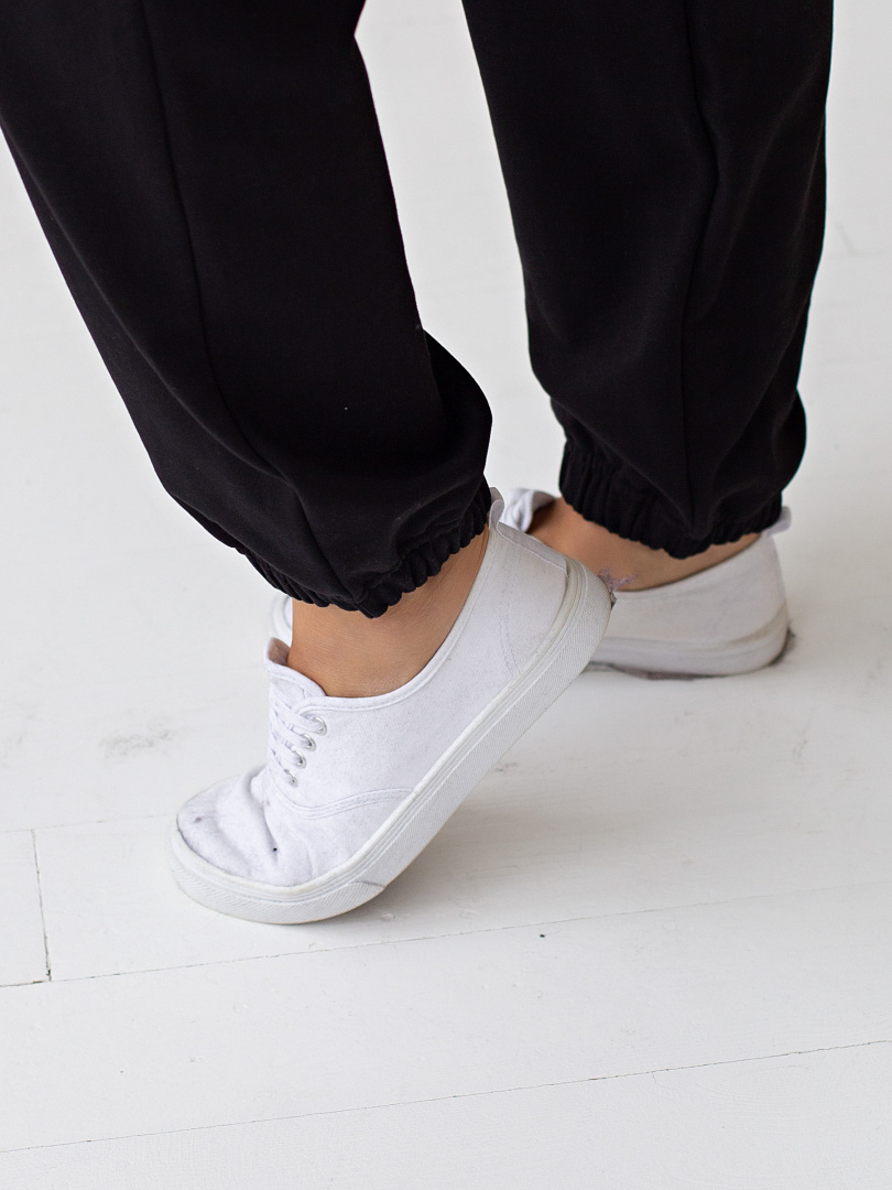 Брюки-джогеры из плотного трикотажа. Модель свободного покроя на резине по низу брюк. Притачной пояс с широкой резинкой и шнуром. На передних половинках боковые карманы с наклонным входом. Современные стильные брюки как для дома, так и для прогулок.