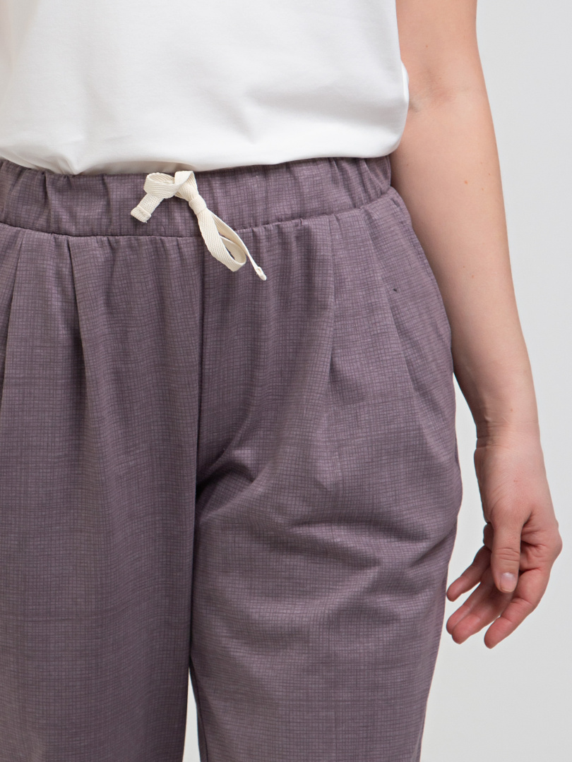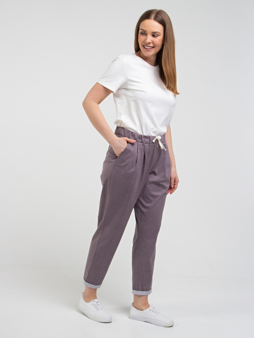 Брюки слегка укороченные. Модель свободного покроя, зауженная книзу. По линии талии мягкие защипы. Притачной пояс с широкой резинкой. На поясе – декоративный шнур. Для удобства предусмотрены карманы. По низу брюк – отвороты.