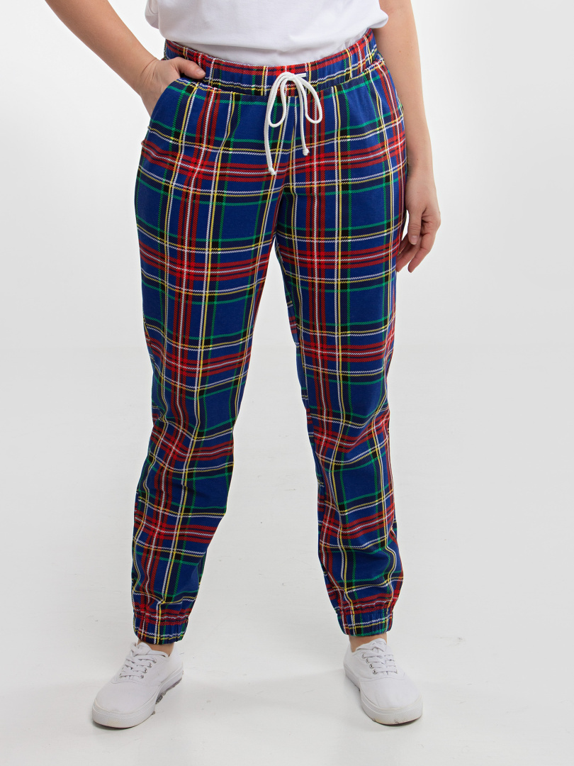 Длинные брюки на широкой резине внизу. Модель прямого покроя слегка заужена книзу. Притачной пояс с широкой резинкой. На передних половинках боковые карманы с наклонным входом.