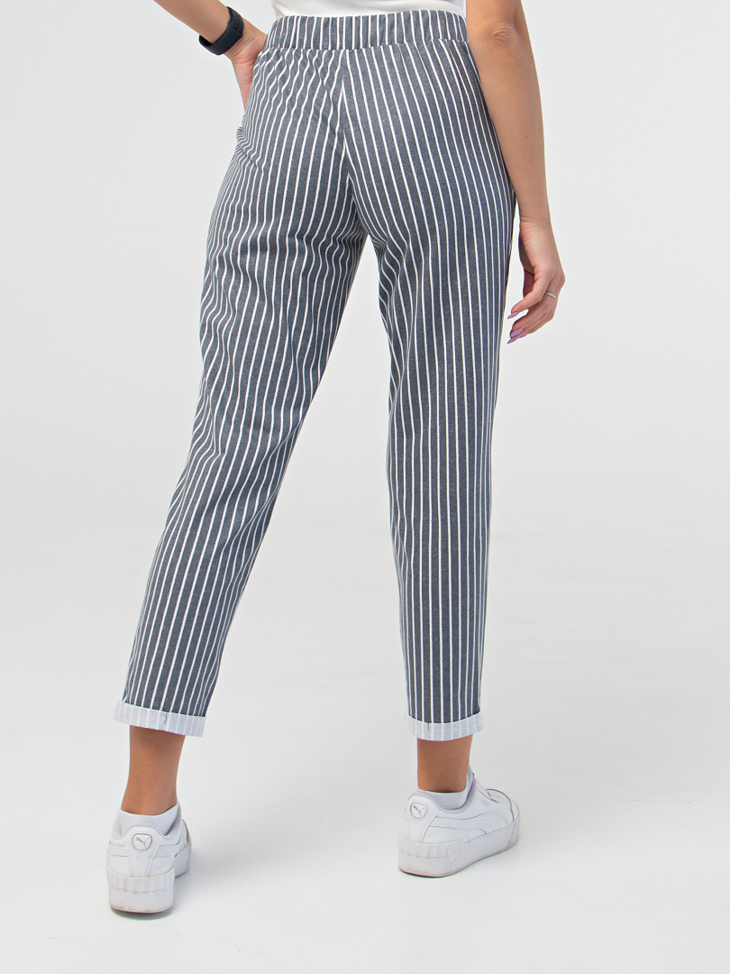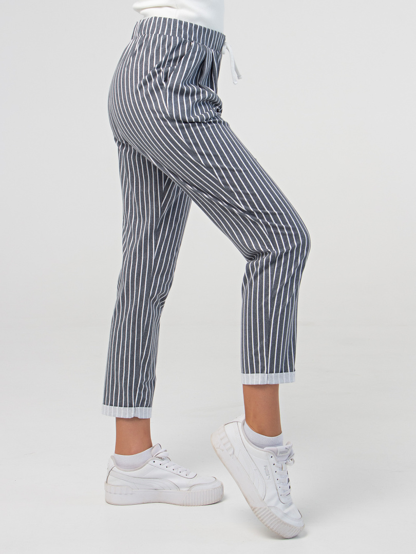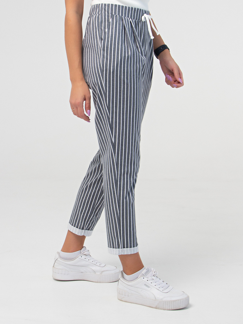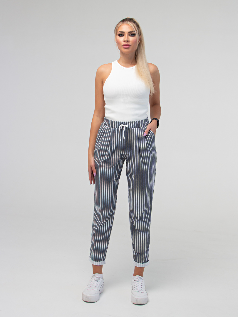 Брюки слегка укороченные. Модель свободного покроя, зауженная книзу. По линии талии мягкие защипы. Притачной пояс с широкой резинкой. На поясе – декоративный шнур. Для удобства предусмотрены карманы. По низу брюк – отвороты.