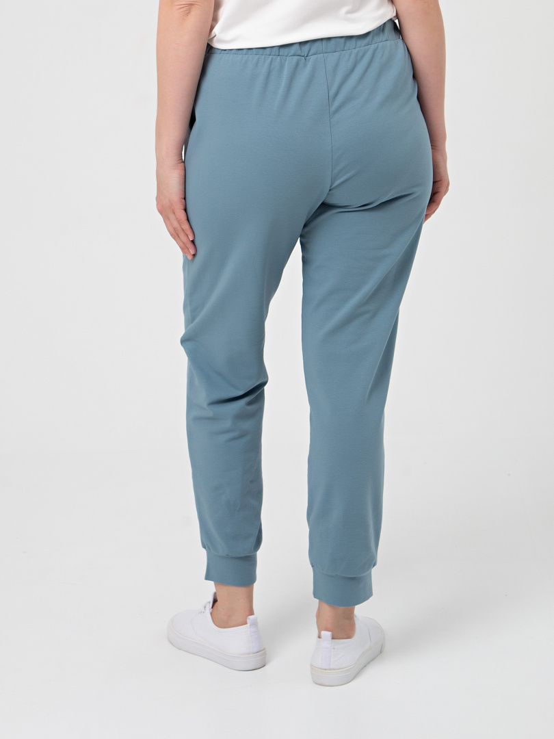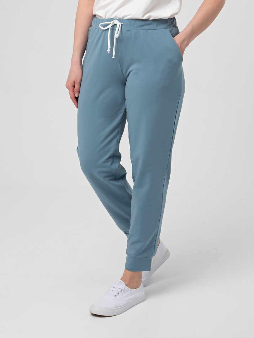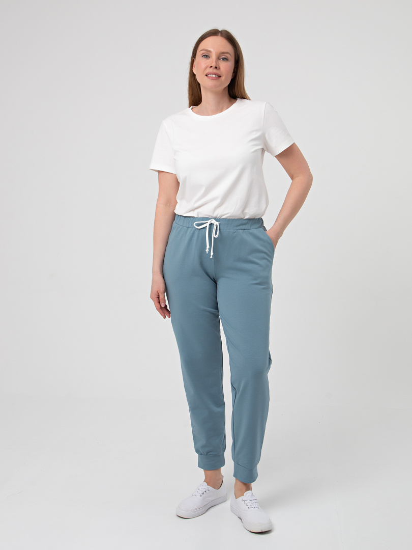 Длинные брюки из плотного трикотажа. Модель средней посадки прямого покроя слегка заужена книзу. Притачной пояс с широкой резинкой и шнуром. На передних половинках боковые карманы с наклонным входом.