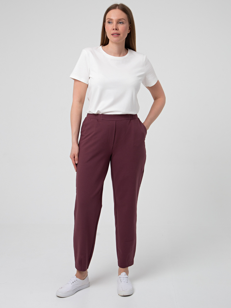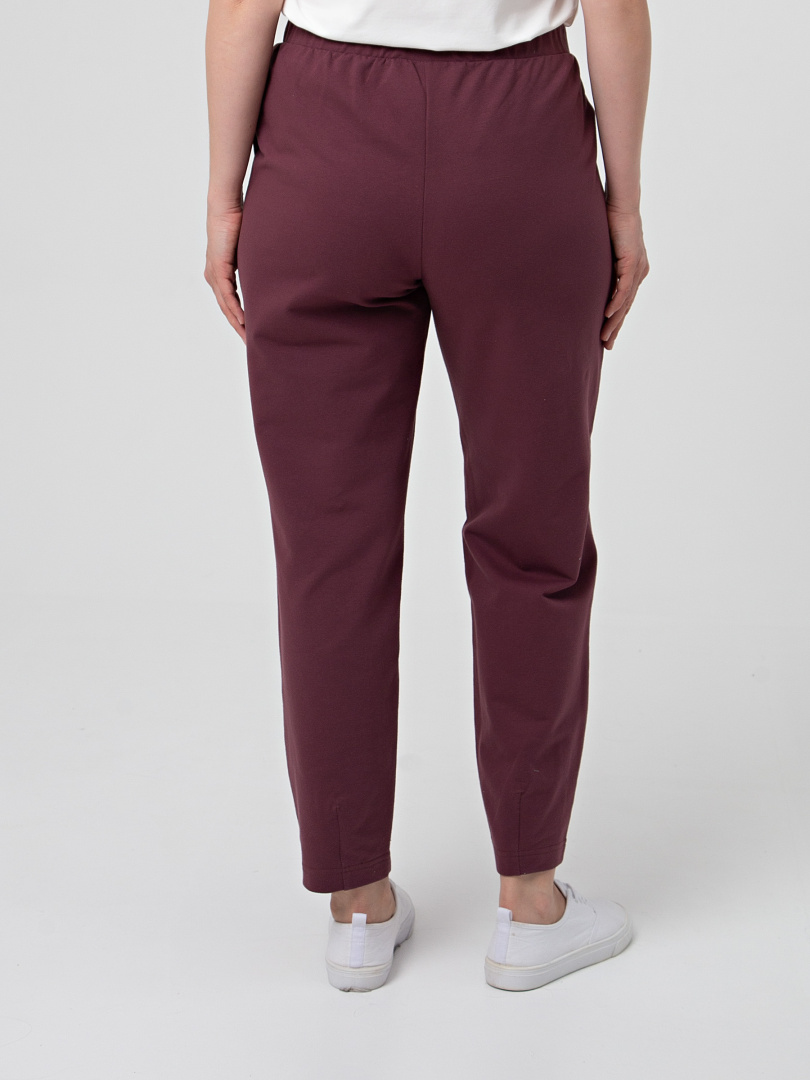 Длинные брюки из плотного трикотажа.  Модель средней посадки прямого покроя  зауженная книзу за счет декоративных вытачек по низу брюк. Притачной пояс с широкой резинкой.  На передних половинках боковые  карманы с наклонным входом. Модель имеет декоративный гульфик.