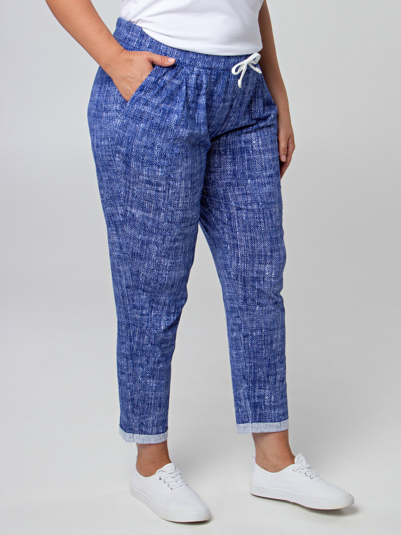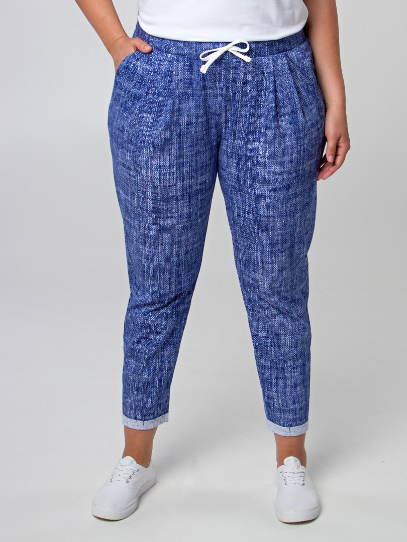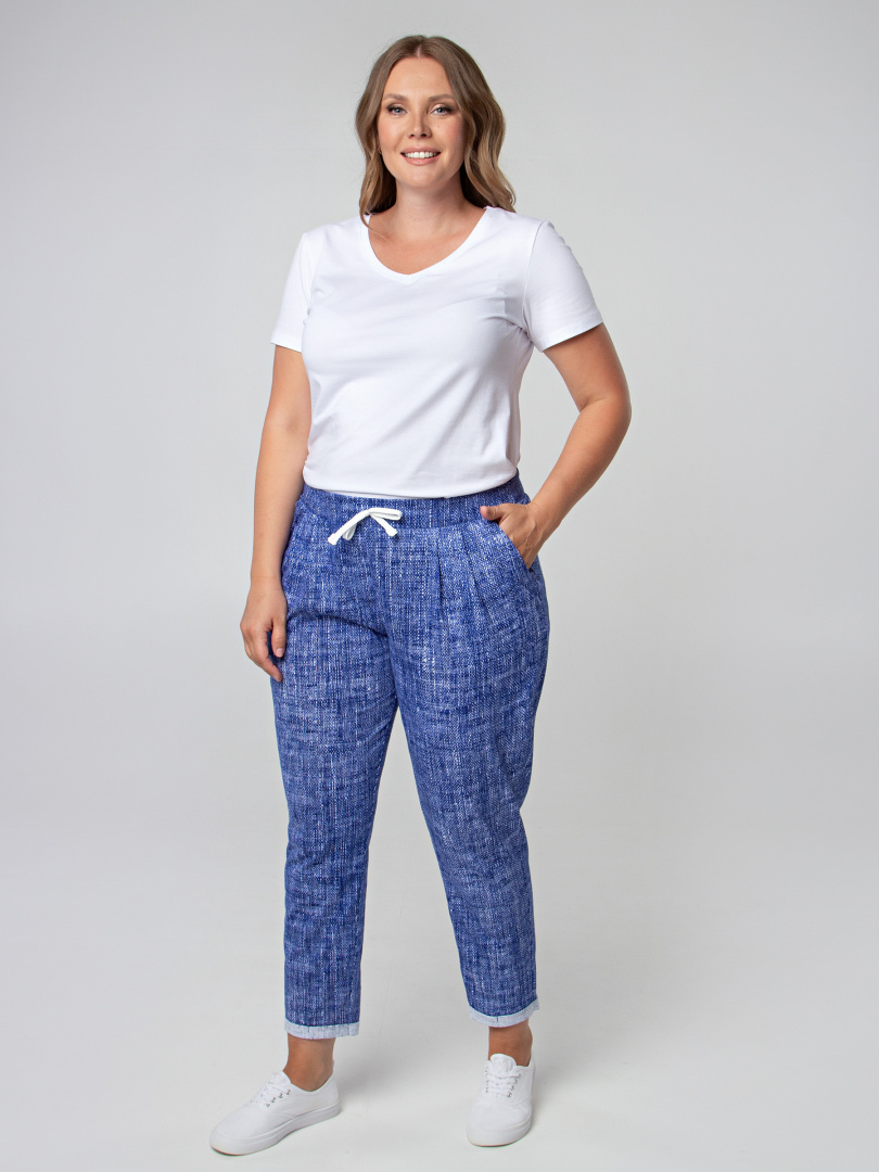 Брюки слегка укороченные. Модель свободного покроя, зауженная книзу. По линии талии мягкие защипы. Притачной пояс с широкой резинкой. На поясе – декоративный шнур. Для удобства предусмотрены карманы. По низу брюк – отвороты.