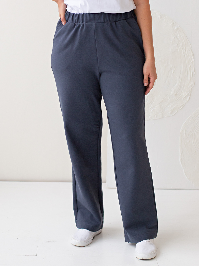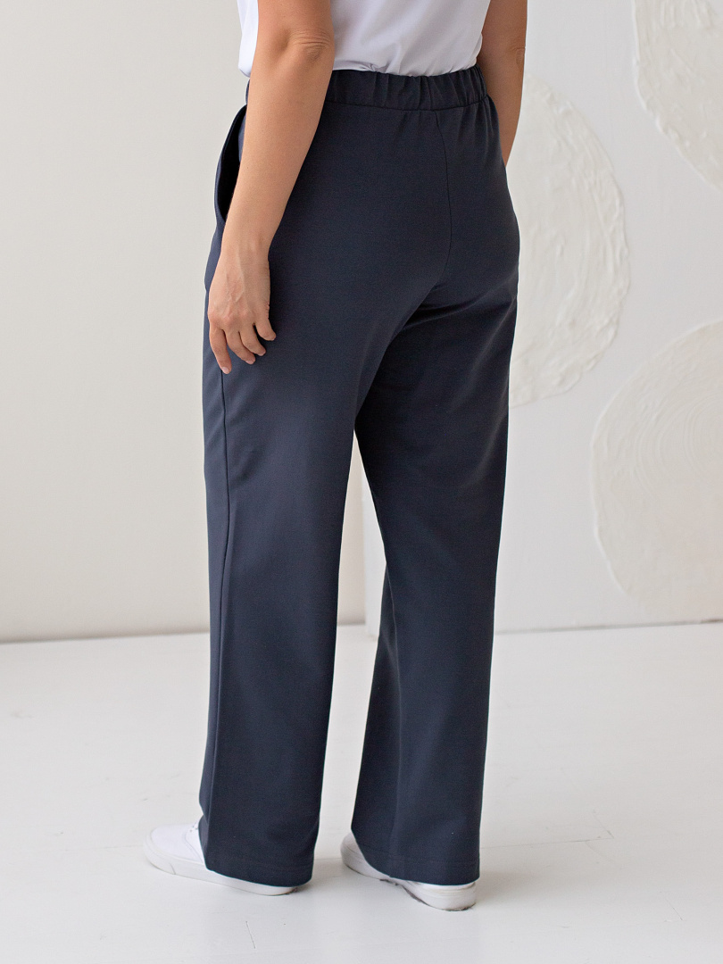 Брюки из плотного трикотажа. Модель прямого силуэта. Притачной пояс с широкой резинкой. На передних половинках боковые карманы с наклонным входом. Современные стильные брюки на любой случай.