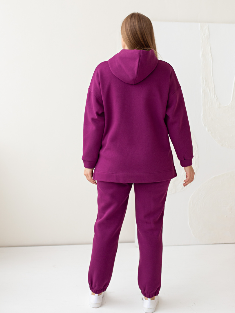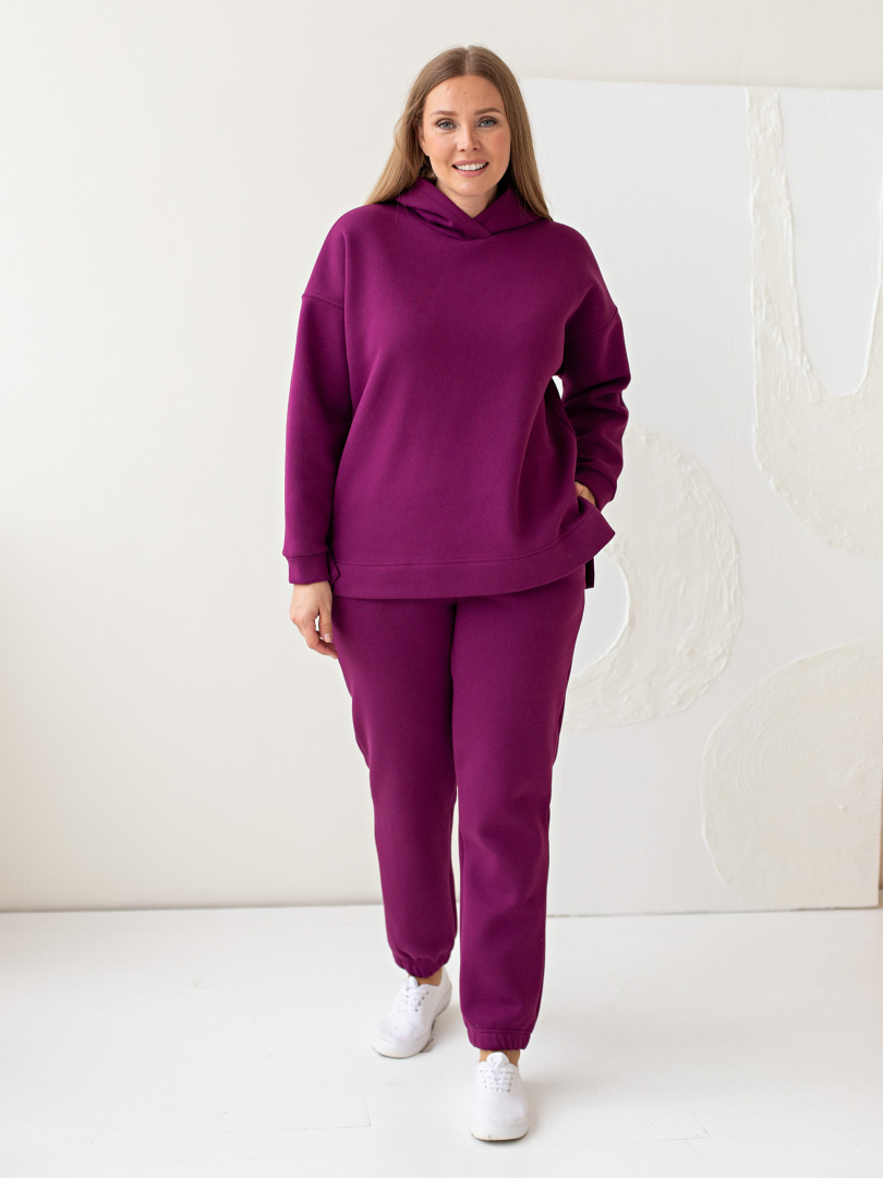 Длинные брюки из плотного трикотажа с начёсом. Модель прямого покроя на резине по низу брюк. Притачной пояс с широкой резинкой. На передних половинках боковые карманы с наклонным входом.