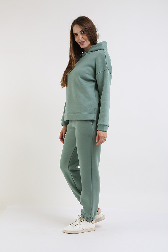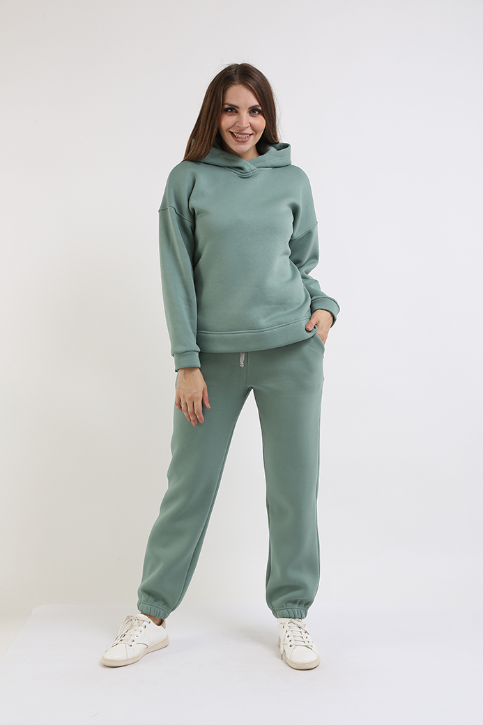 Длинные брюки из плотного трикотажа с начёсом. Модель прямого покроя на резине по низу брюк. Притачной пояс с широкой резинкой. На передних половинках боковые карманы с наклонным входом.