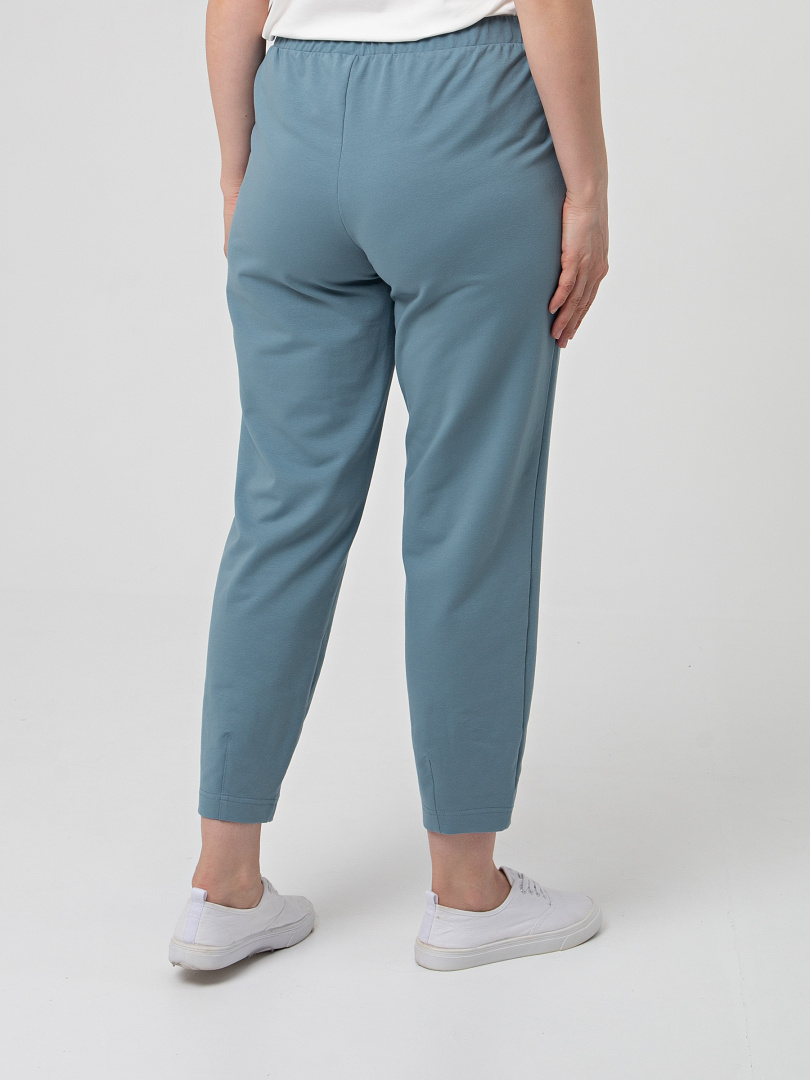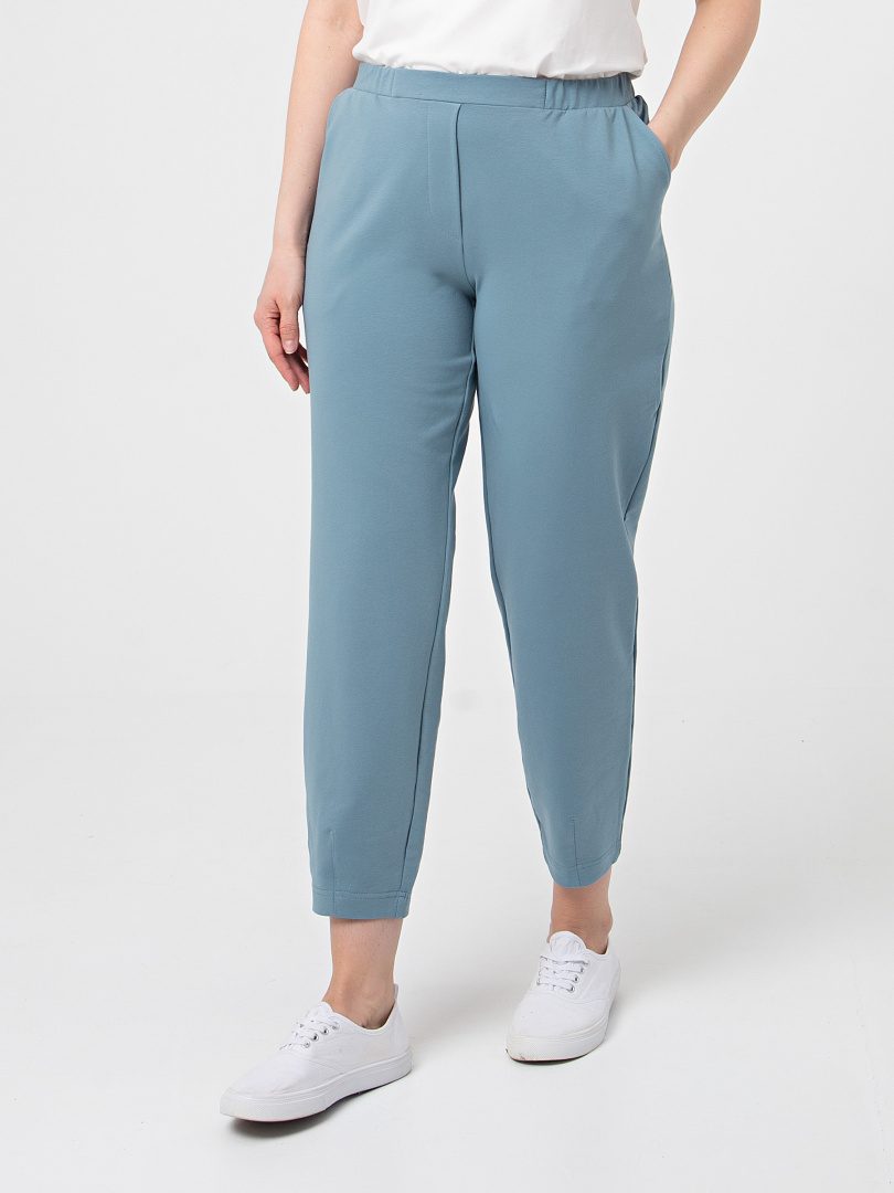 Длинные брюки из плотного трикотажа.  Модель средней посадки прямого покроя  зауженная книзу за счет декоративных вытачек по низу брюк. Притачной пояс с широкой резинкой.  На передних половинках боковые  карманы с наклонным входом. Модель имеет декоративный гульфик.