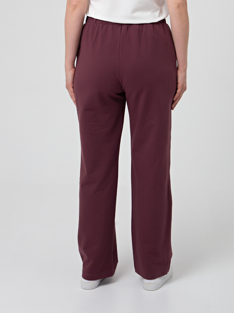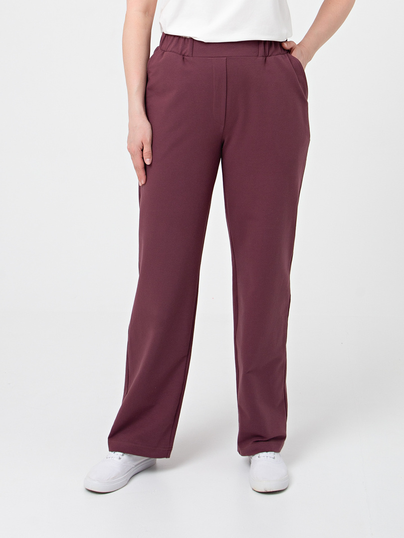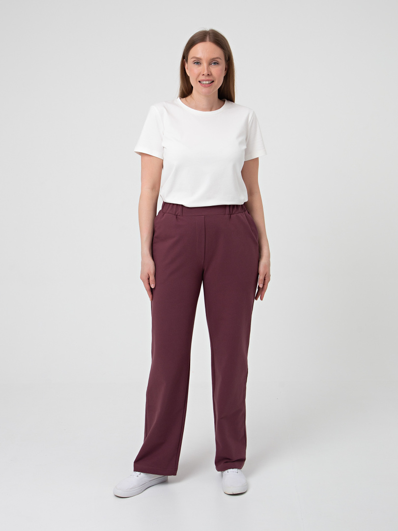 Брюки из плотного трикотажа. Модель прямого силуэта. Притачной пояс с широкой резинкой. На передних половинках боковые карманы с наклонным входом. Современные стильные брюки на любой случай.