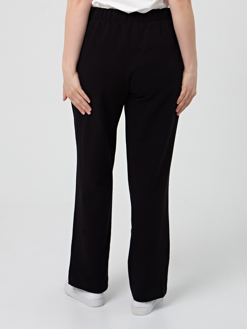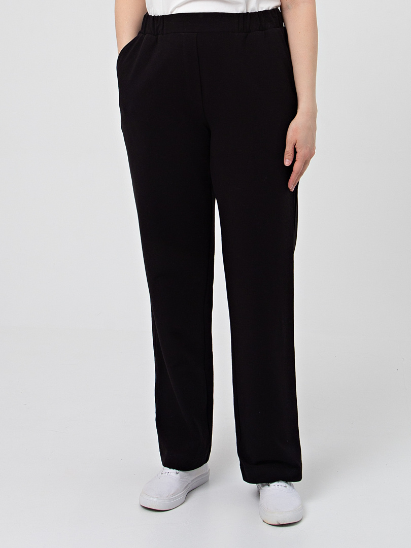 Брюки из плотного трикотажа. Модель прямого силуэта. Притачной пояс с широкой резинкой. На передних половинках боковые карманы с наклонным входом. Современные стильные брюки на любой случай.