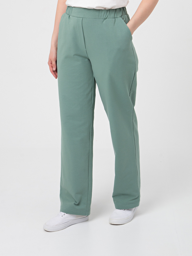 Брюки из плотного трикотажа. Модель прямого силуэта. Притачной пояс с широкой резинкой. На передних половинках боковые карманы с наклонным входом. Современные стильные брюки на любой случай.