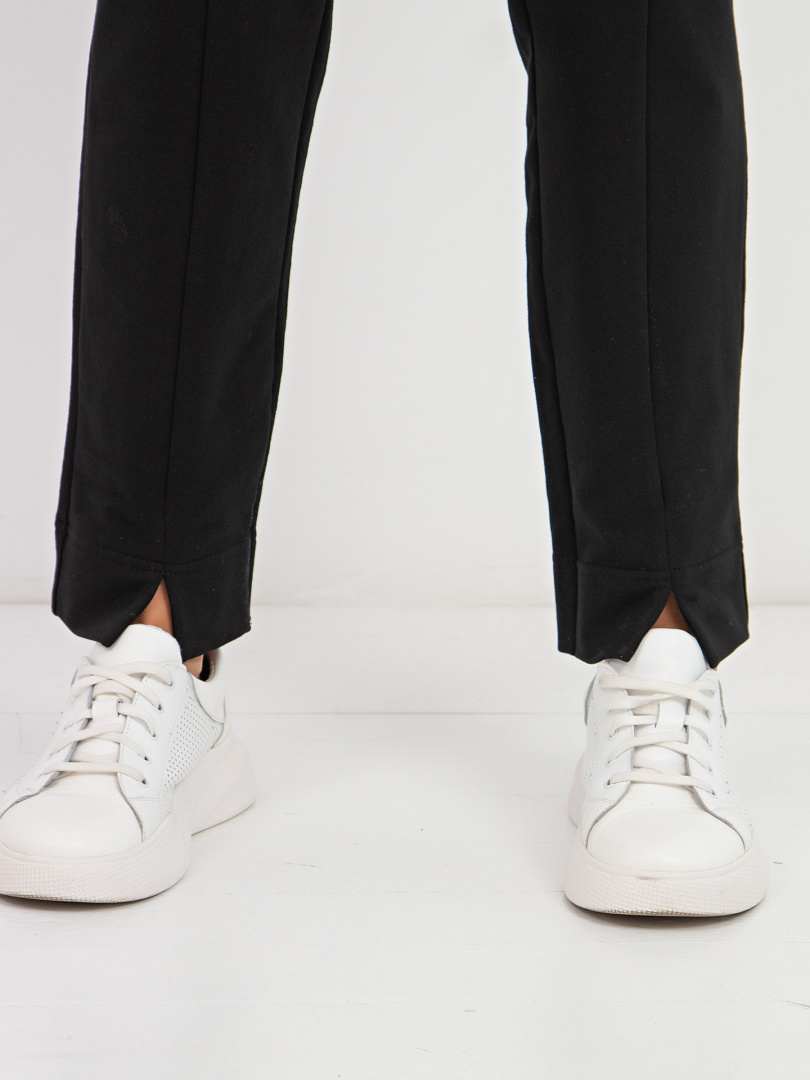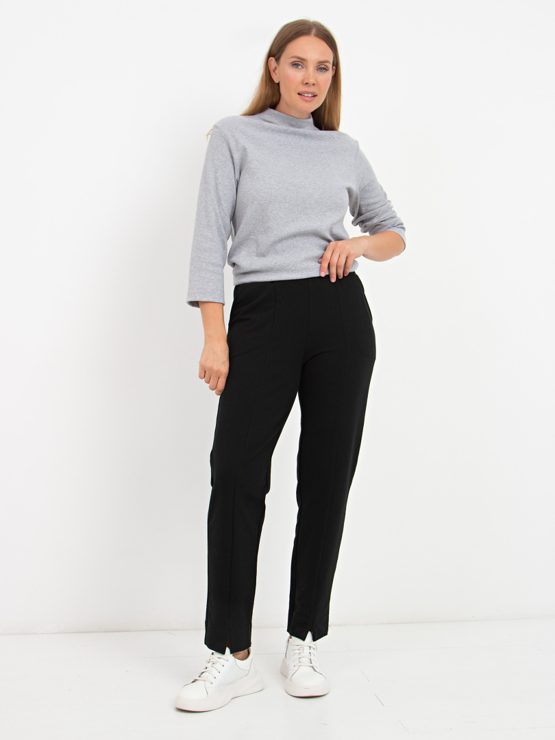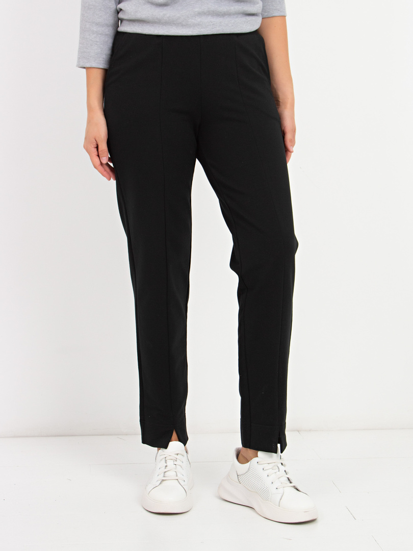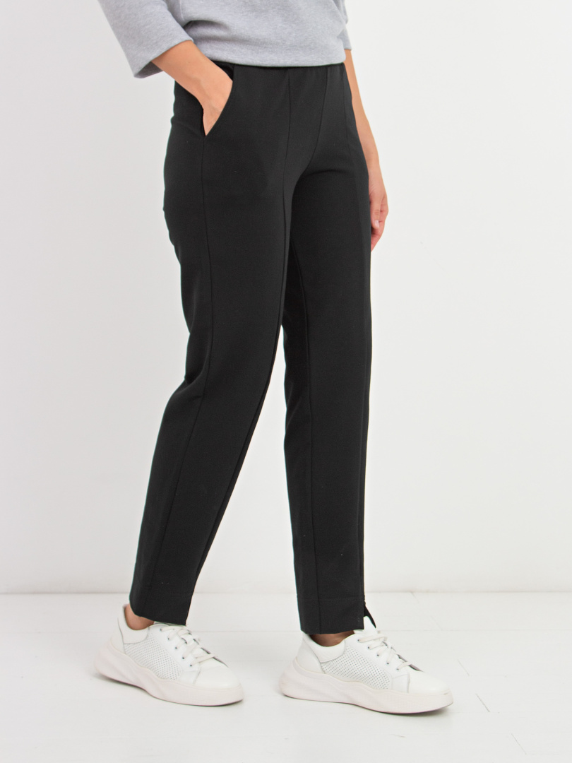 Длинные брюки из плотного трикотажа.  Модель средней посадки прямого покроя  слегка заужена книзу. Середина передней половинки – шов, переходящий в небольшой разрез по низу брюк. Притачной пояс с широкой резинкой.  На передних половинках боковые  карманы с наклонным входом.