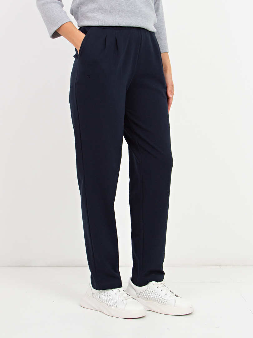 Брюки свободного покроя, слегка зауженные книзу. По линии талии мягкие защипы. Притачной пояс с широкой резинкой. Для удобства предусмотрены карманы.