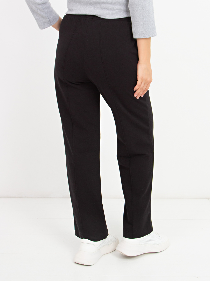 Длинные брюки из плотного трикотажа. Модель средней посадки прямого покроя с отстроченными складками. Притачной пояс с широкой резинкой. На передних половинках боковые карманы с наклонным входом.