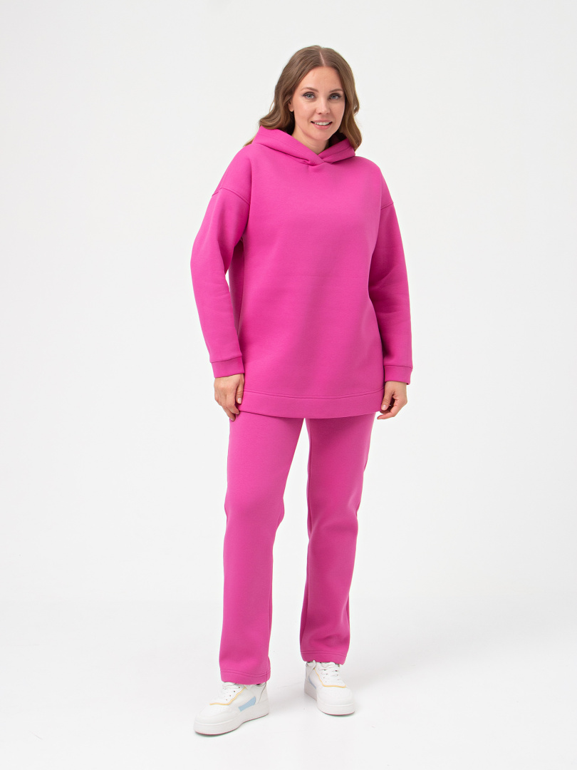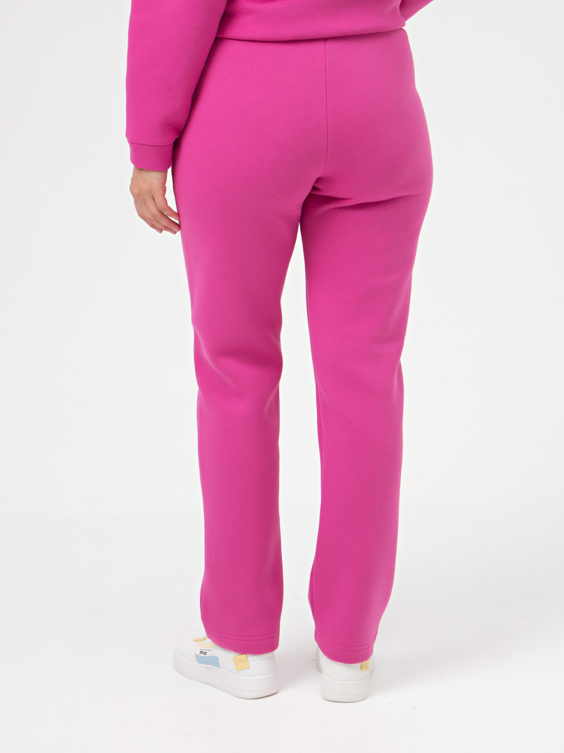 Длинные брюки из трикотажа. Модель прямого покроя. Притачной пояс с широкой резинкой. На передних половинках боковые карманы с наклонным входом.