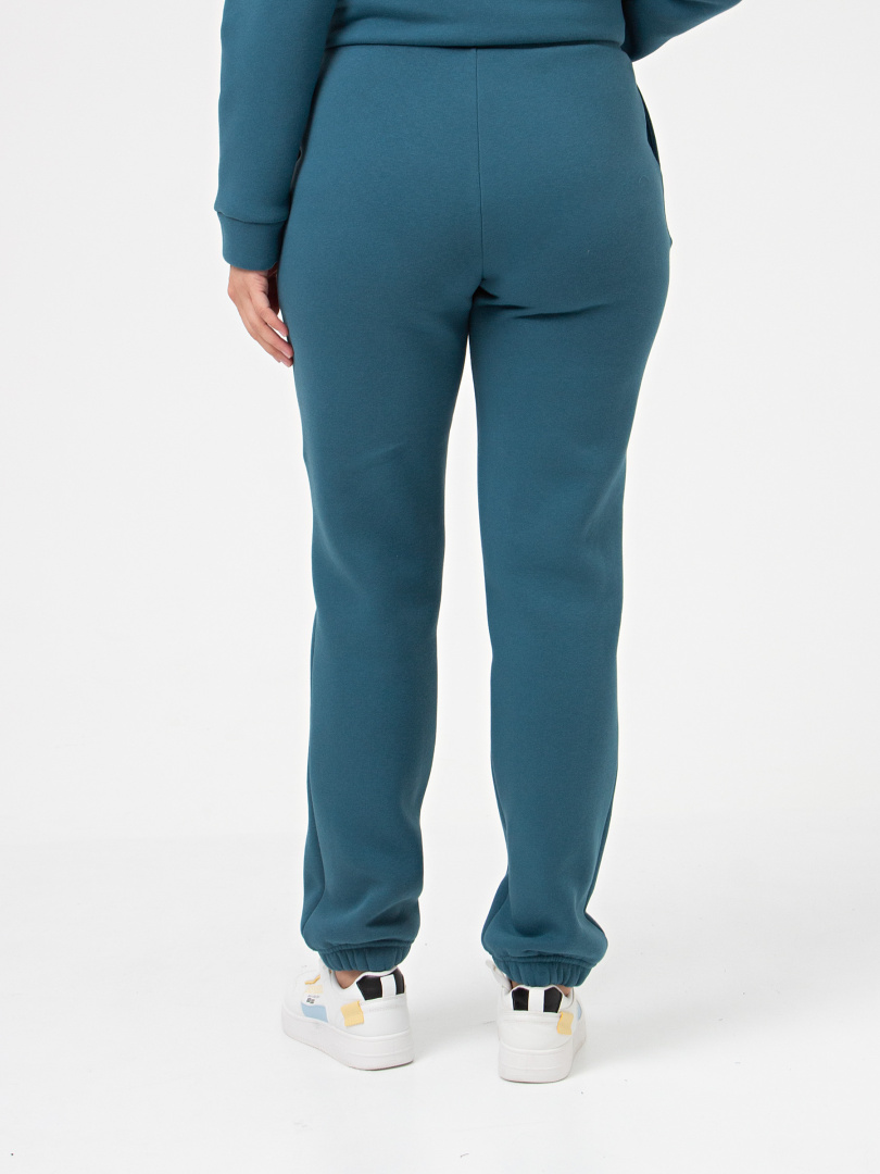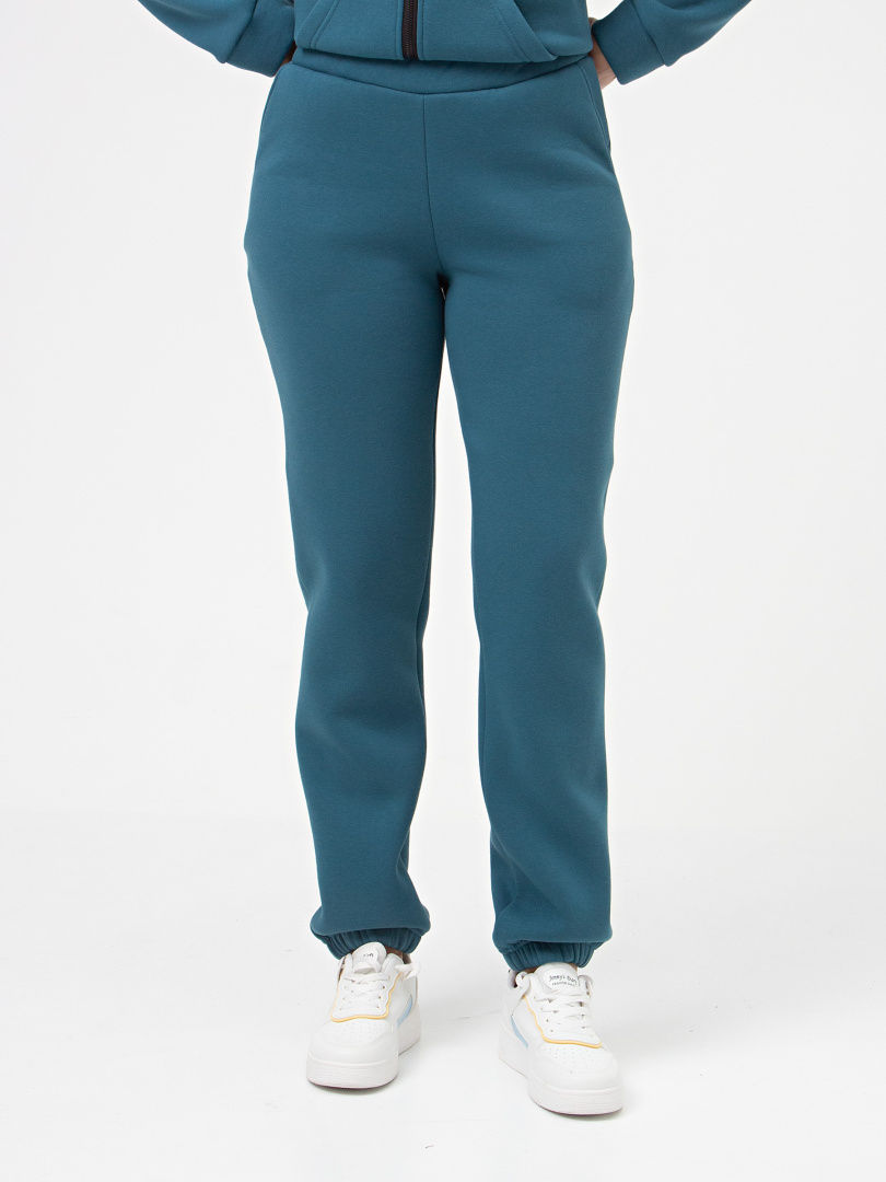 Длинные брюки из плотного трикотажа с начёсом. Модель прямого покроя на резине по низу брюк. Притачной пояс с широкой резинкой. На передних половинках боковые карманы с наклонным входом.