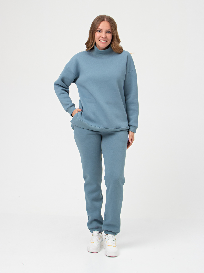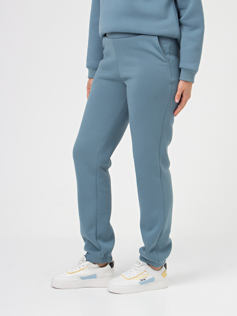 Длинные брюки из плотного трикотажа с начёсом. Модель прямого покроя на резине по низу брюк. Притачной пояс с широкой резинкой. На передних половинках боковые карманы с наклонным входом.