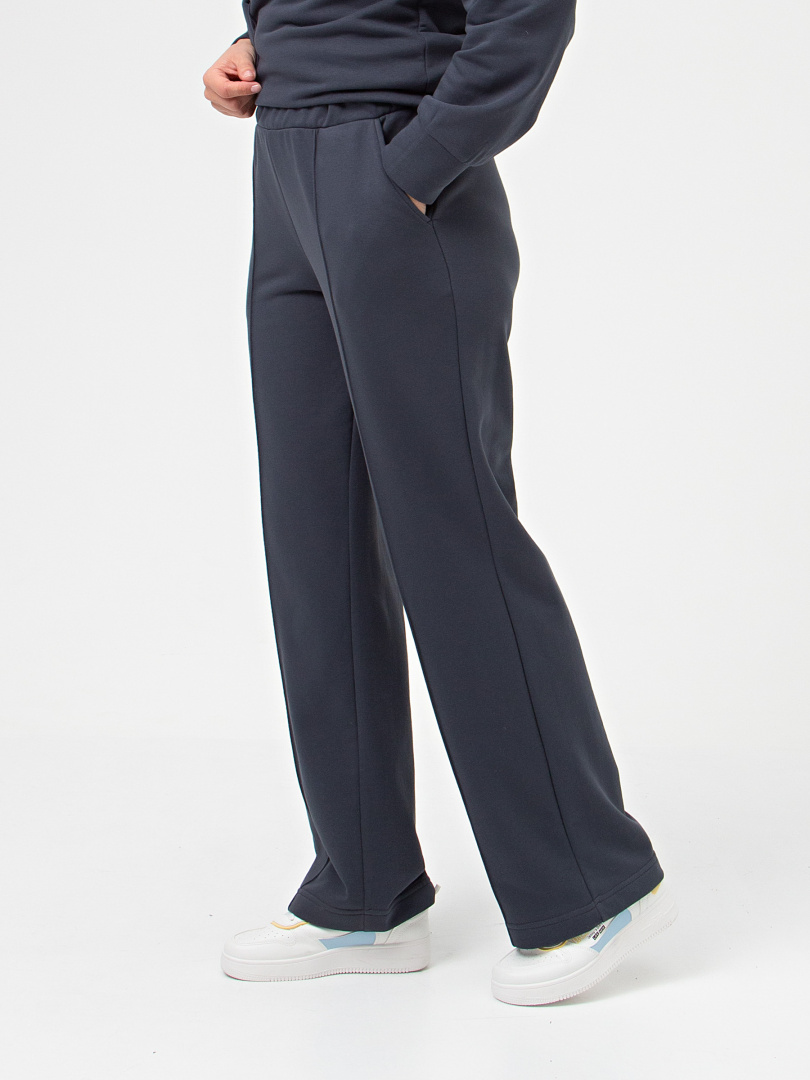 Брюки из плотного мягкого трикотажа. Модель прямого силуэта средней посадки. Притачной пояс с широкой резинкой. На передних половинках застроченные складки и боковые карманы с наклонным входом. Современные стильные брюки на любой случай.