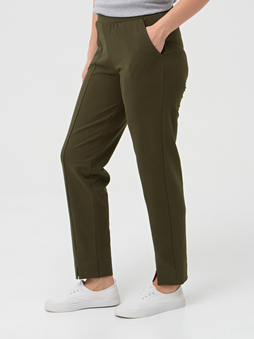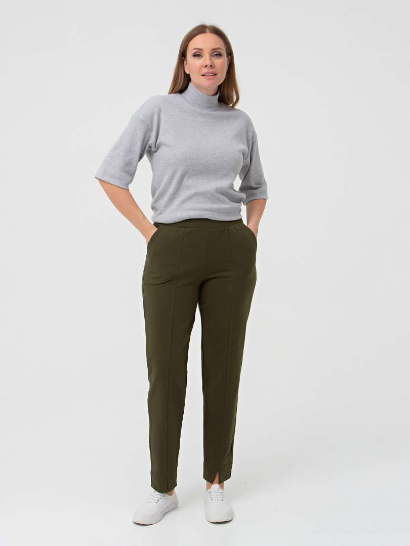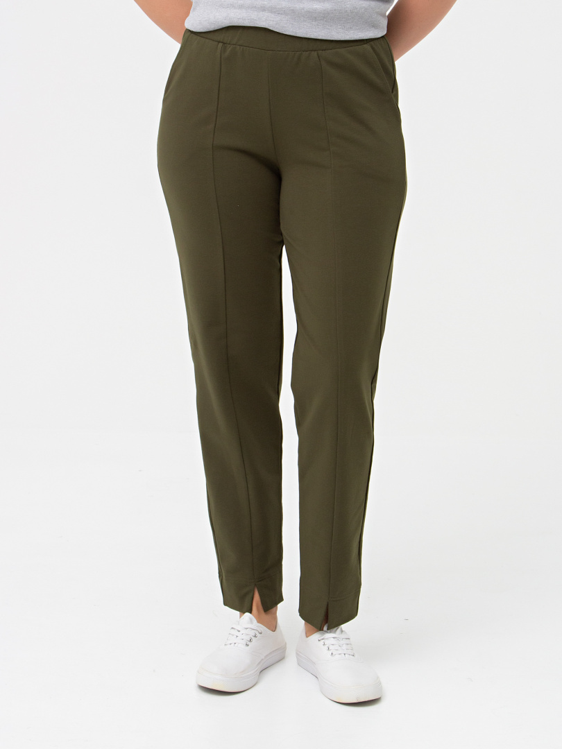 Длинные брюки из плотного трикотажа.  Модель средней посадки прямого покроя  слегка заужена книзу. Середина передней половинки – шов, переходящий в небольшой разрез по низу брюк. Притачной пояс с широкой резинкой.  На передних половинках боковые  карманы с наклонным входом.