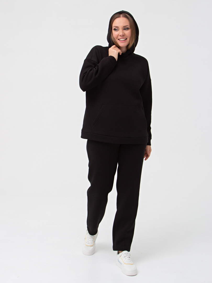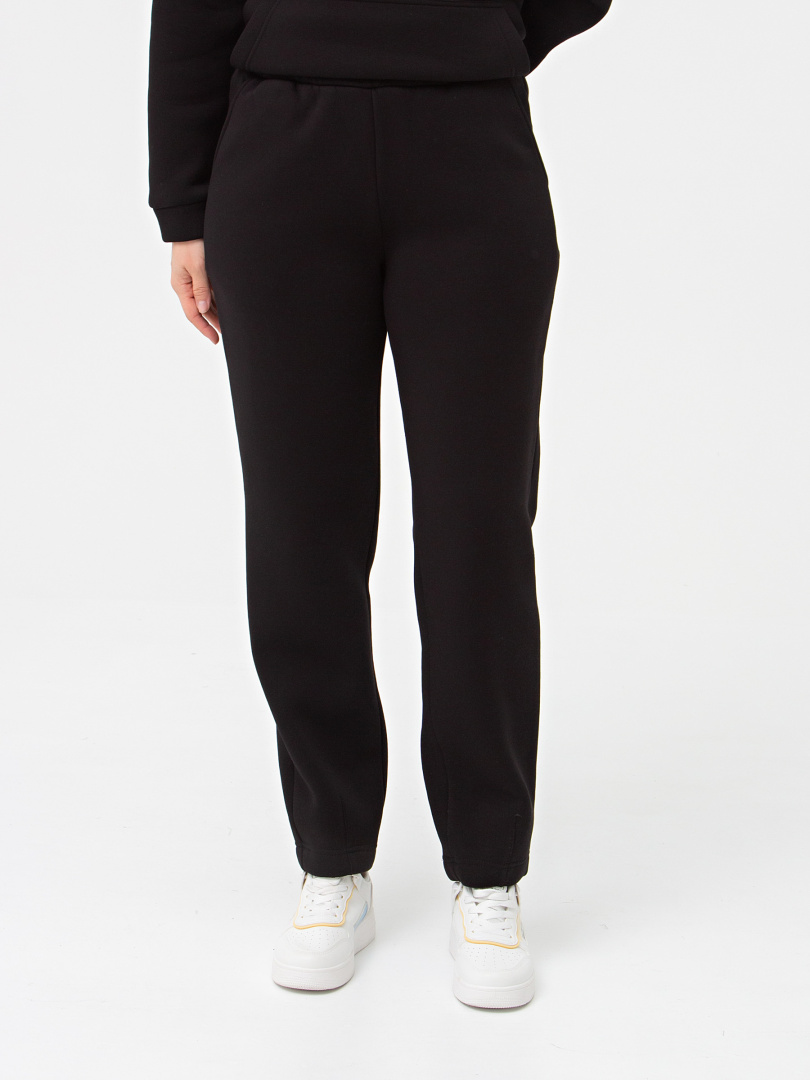 Длинные брюки из плотного трикотажа. Модель средней посадки прямого покроя зауженная книзу за счет декоративных вытачек по низу брюк. Притачной пояс с широкой резинкой. На передних половинках боковые карманы с наклонным входом.