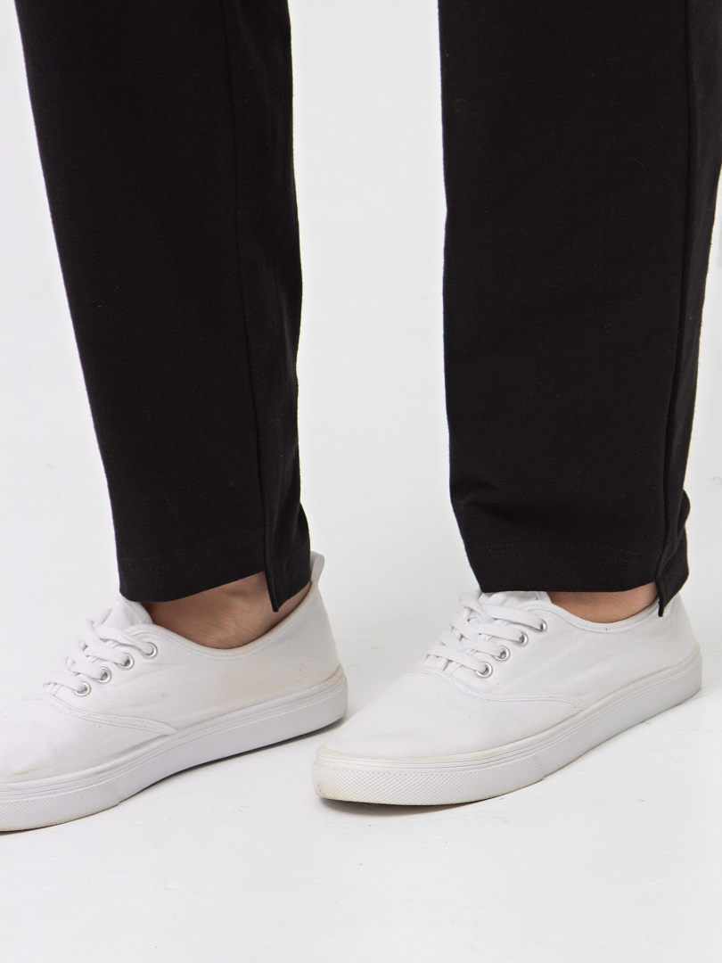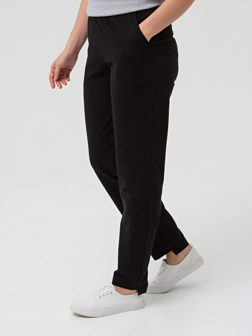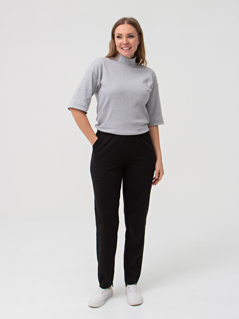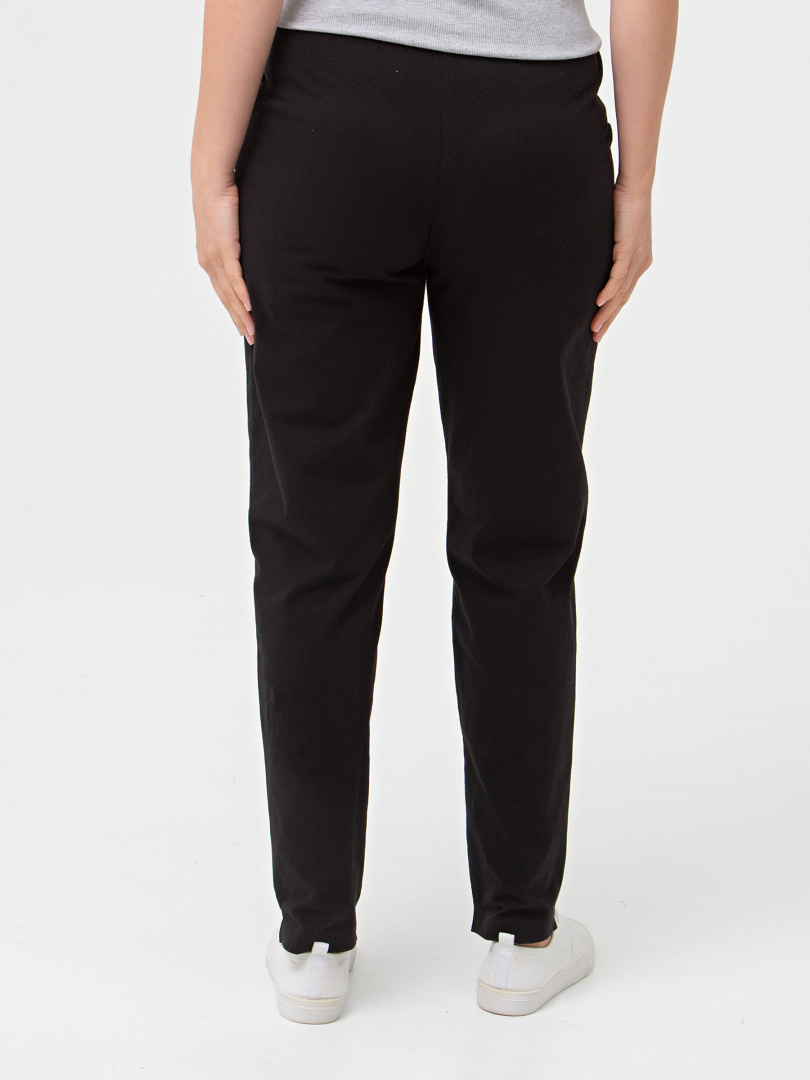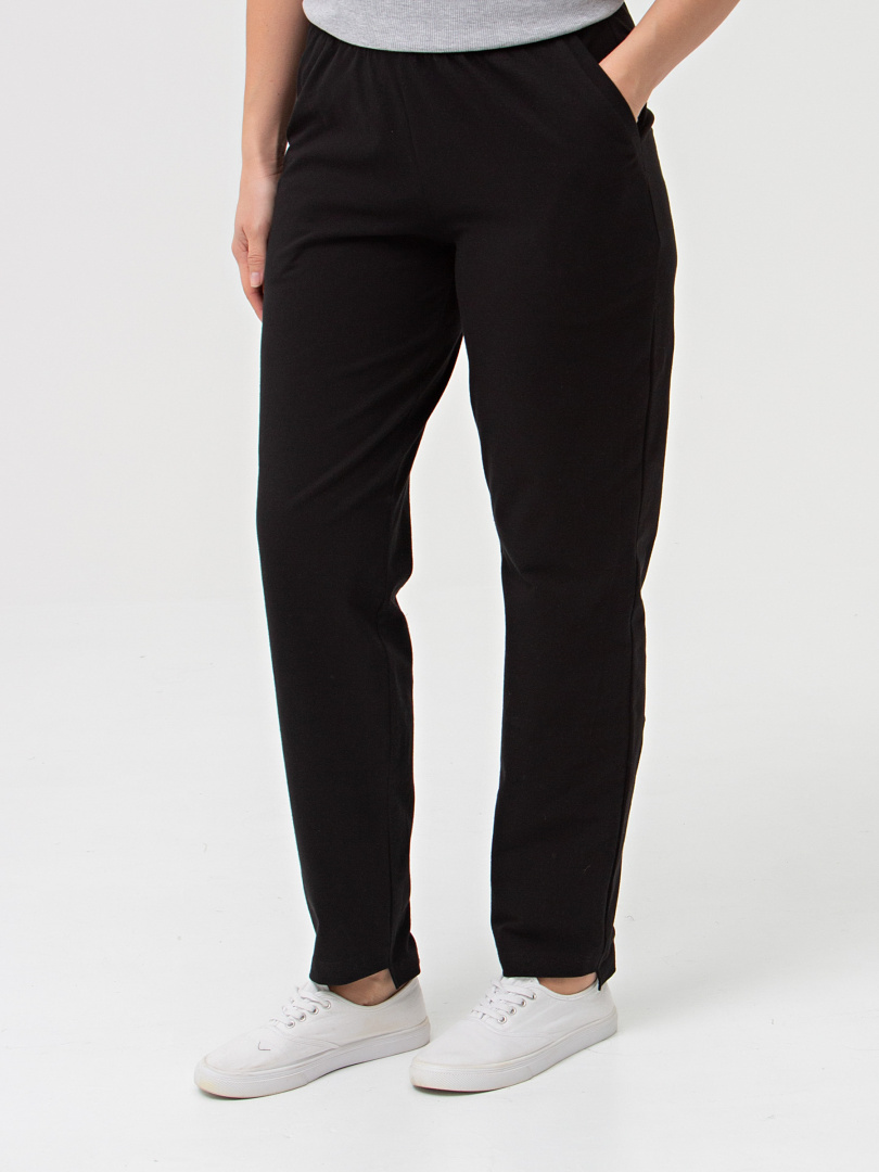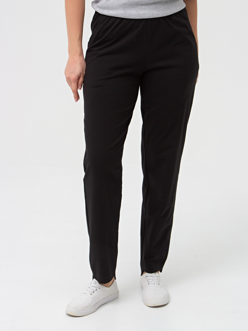 Трикотажные бриджи длиной до середины икры. Модель прямого покроя с разным уровнем низа. Притачной пояс с широкой резинкой. На передней половинке боковые карманы.