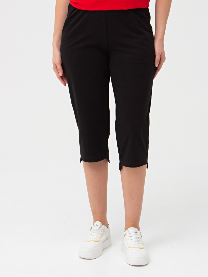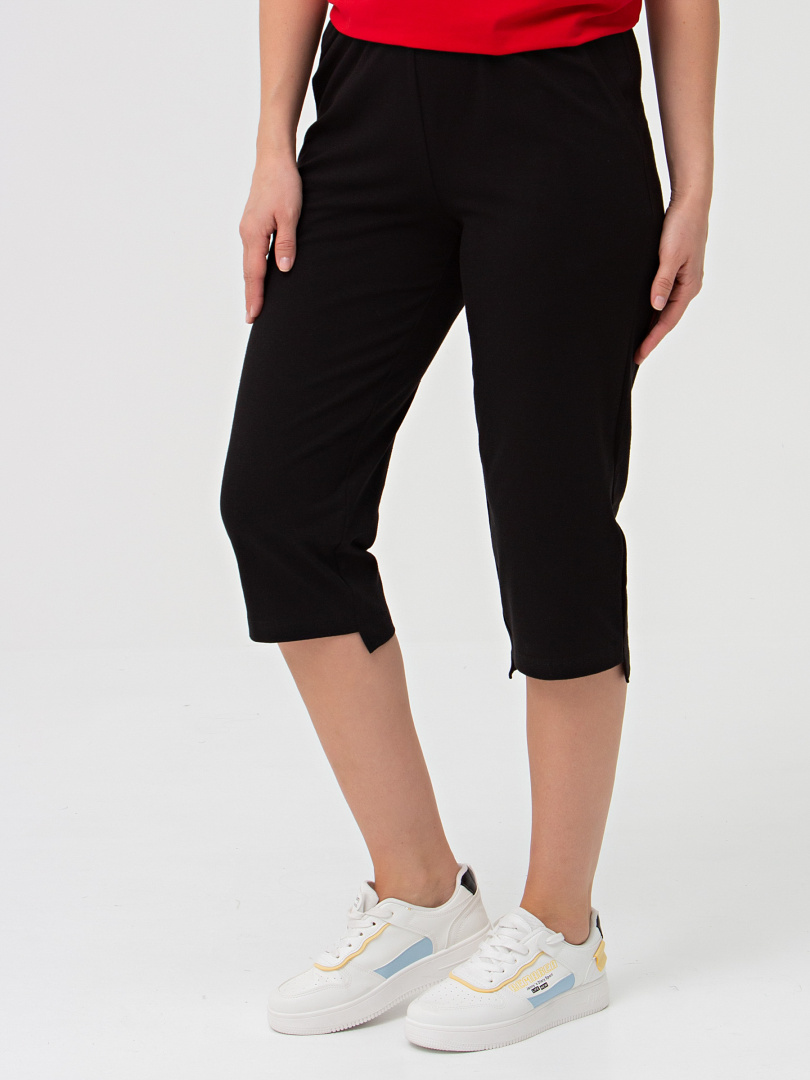 Трикотажные бриджи длиной до середины икры. Модель прямого покроя с разным уровнем низа. Притачной пояс с широкой резинкой. На передней половинке боковые карманы.