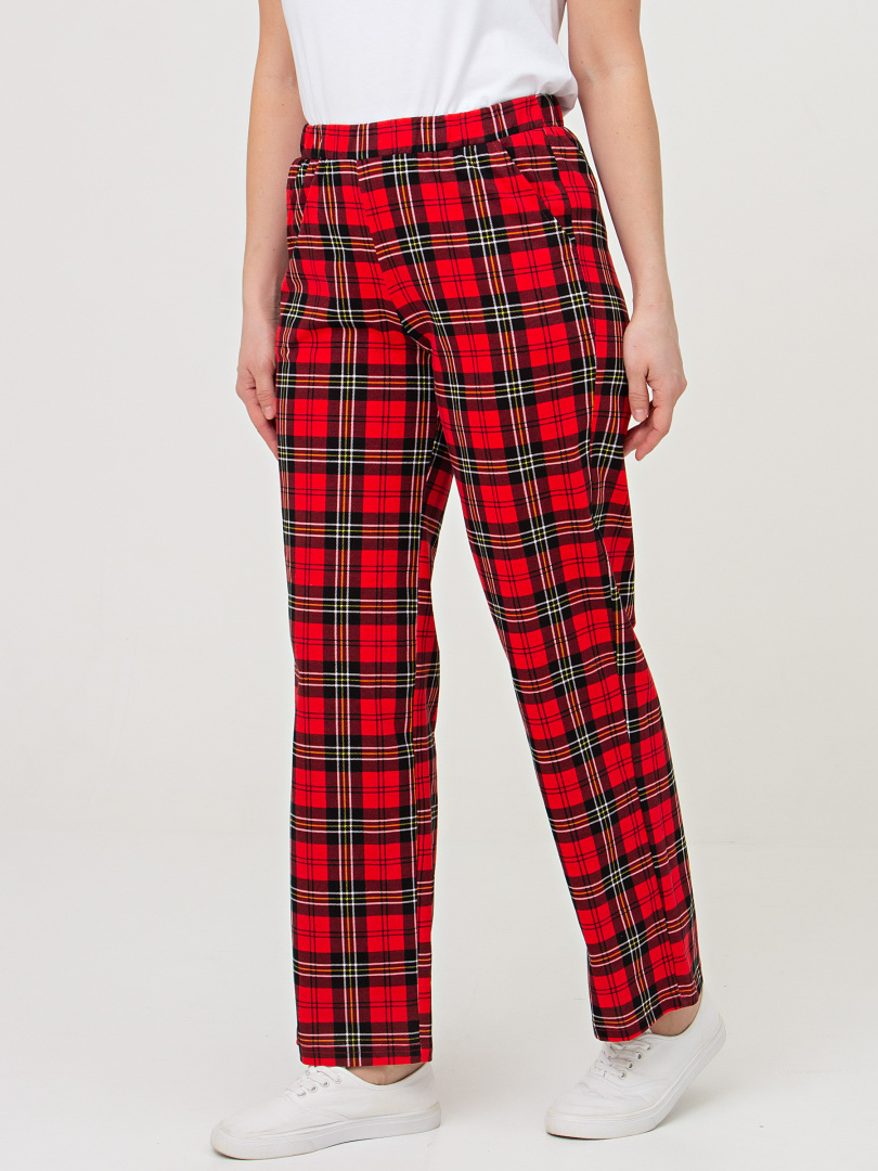 Длинные брюки прямого покроя. Притачной пояс с широкой резинкой. На передних половинках боковые карманы с наклонным входом.