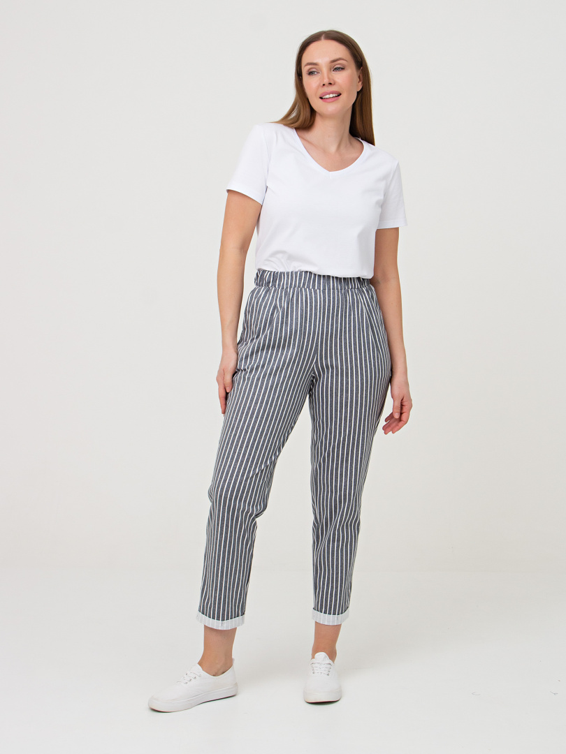 Брюки слегка укороченные. Модель свободного покроя, зауженная книзу. По линии талии мягкие защипы. Притачной пояс с широкой резинкой. Для удобства предусмотрены карманы. По низу брюк – отвороты.